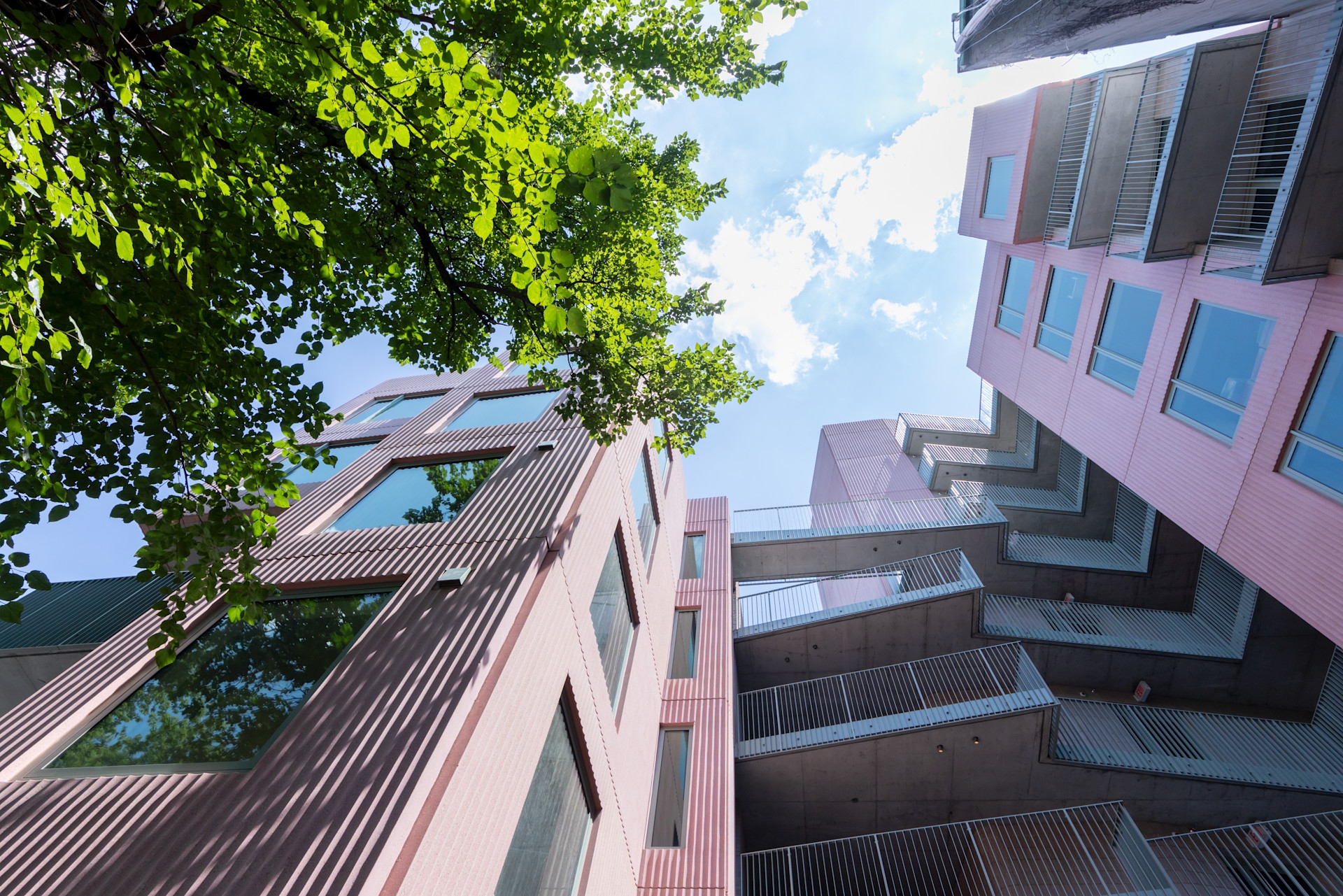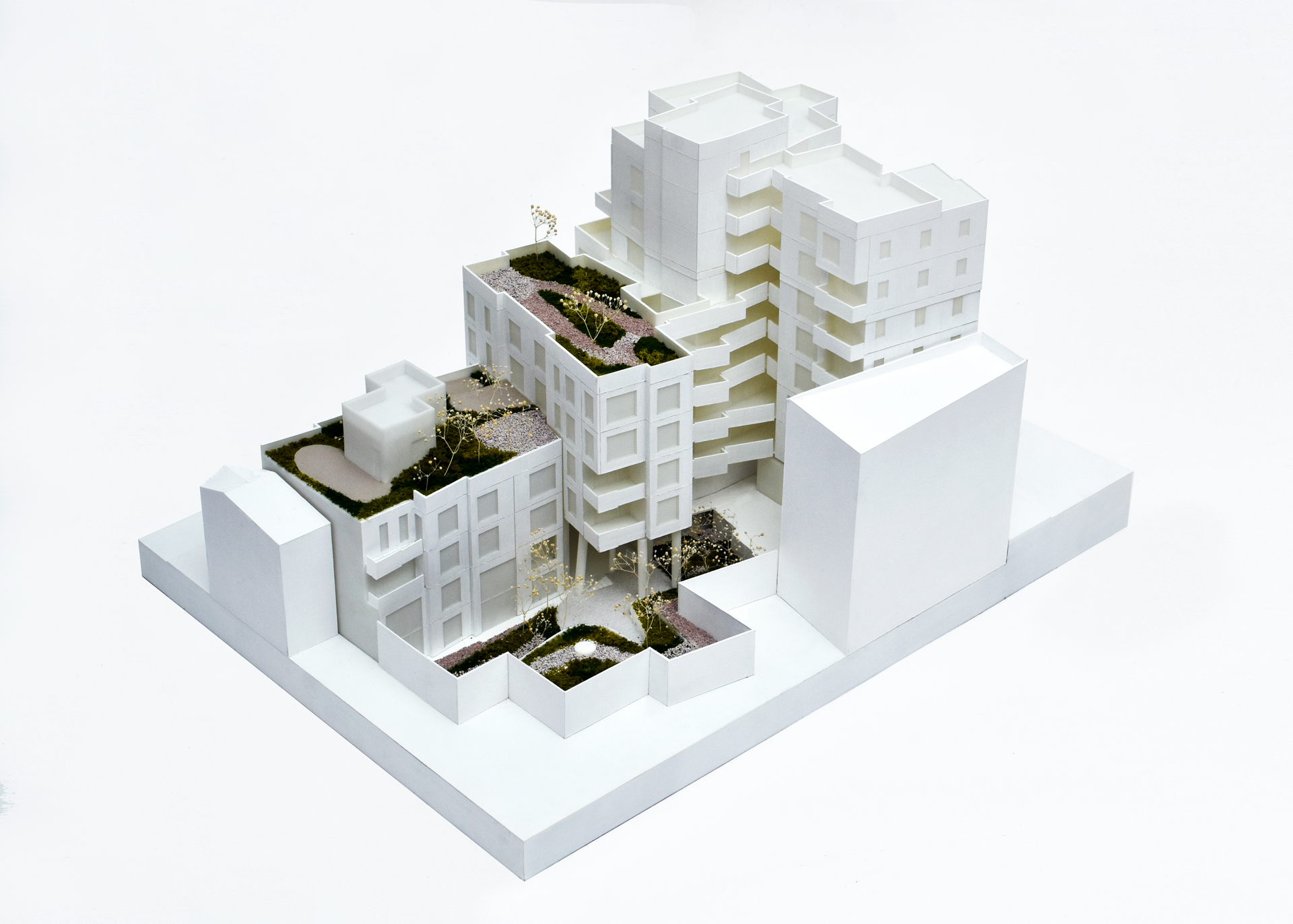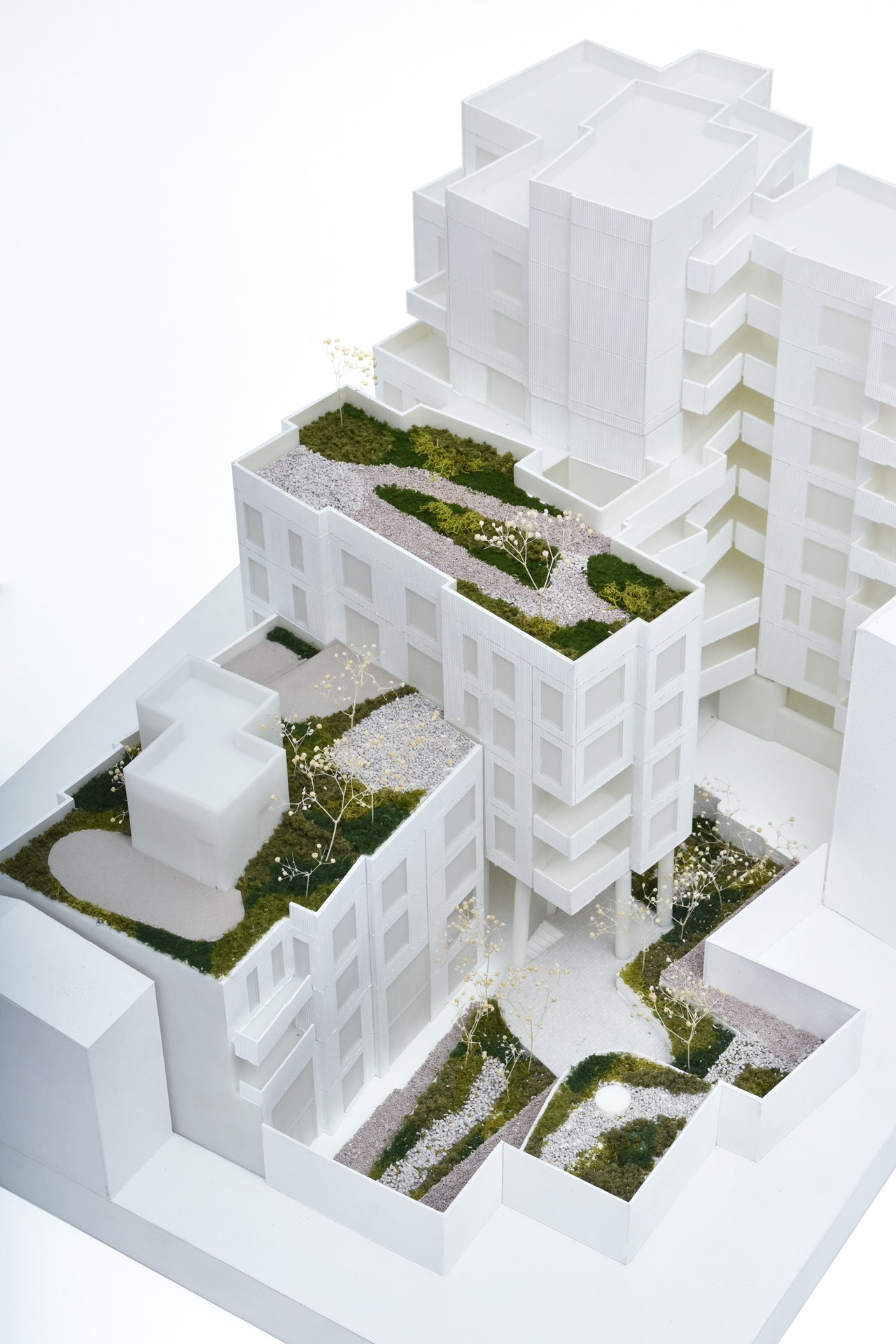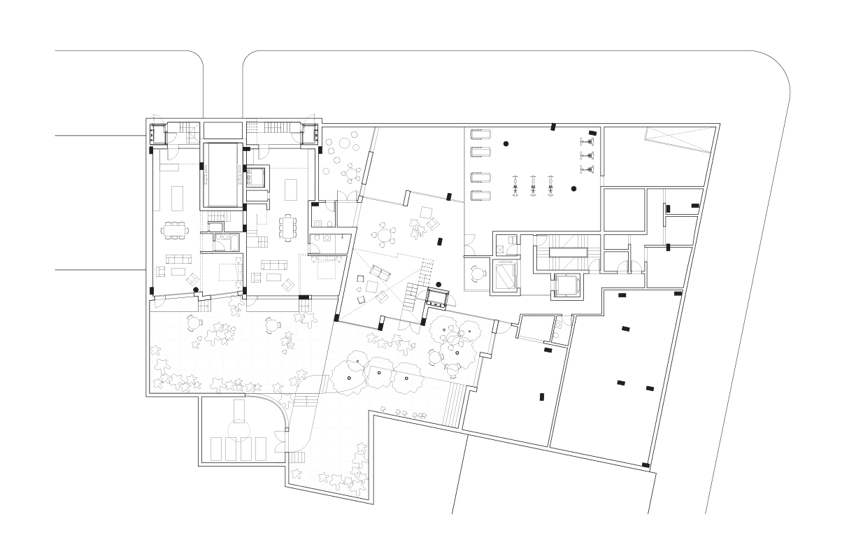 The building is filled with greenery. Its staggered design offers a variety of communal outdoor spaces, each distinct in size and function, fostering collective activities. A verdant, secluded backyard extends the local streetscape, while a central courtyard is enlivened by surrounding movement. An elevated public square also provides a visible communal area that blends indoor and outdoor environments.