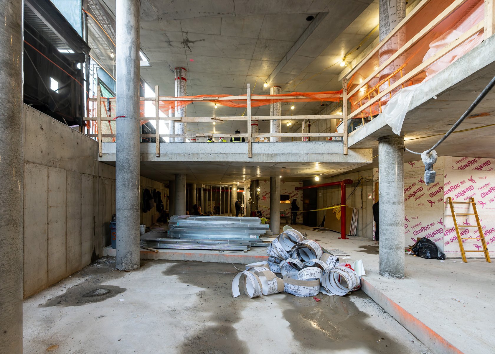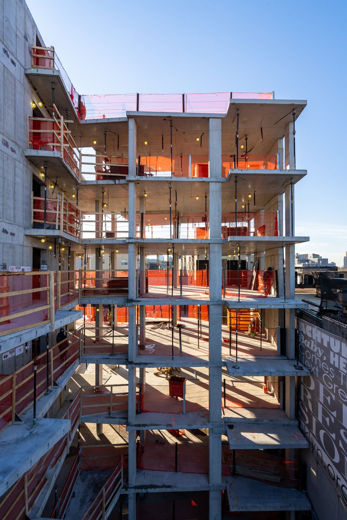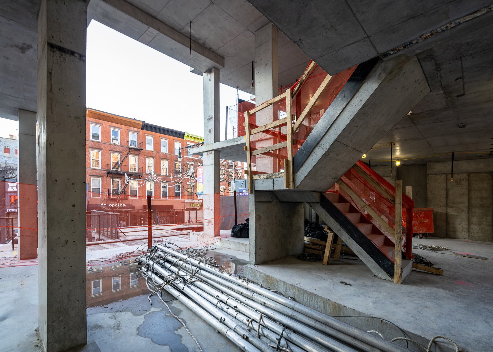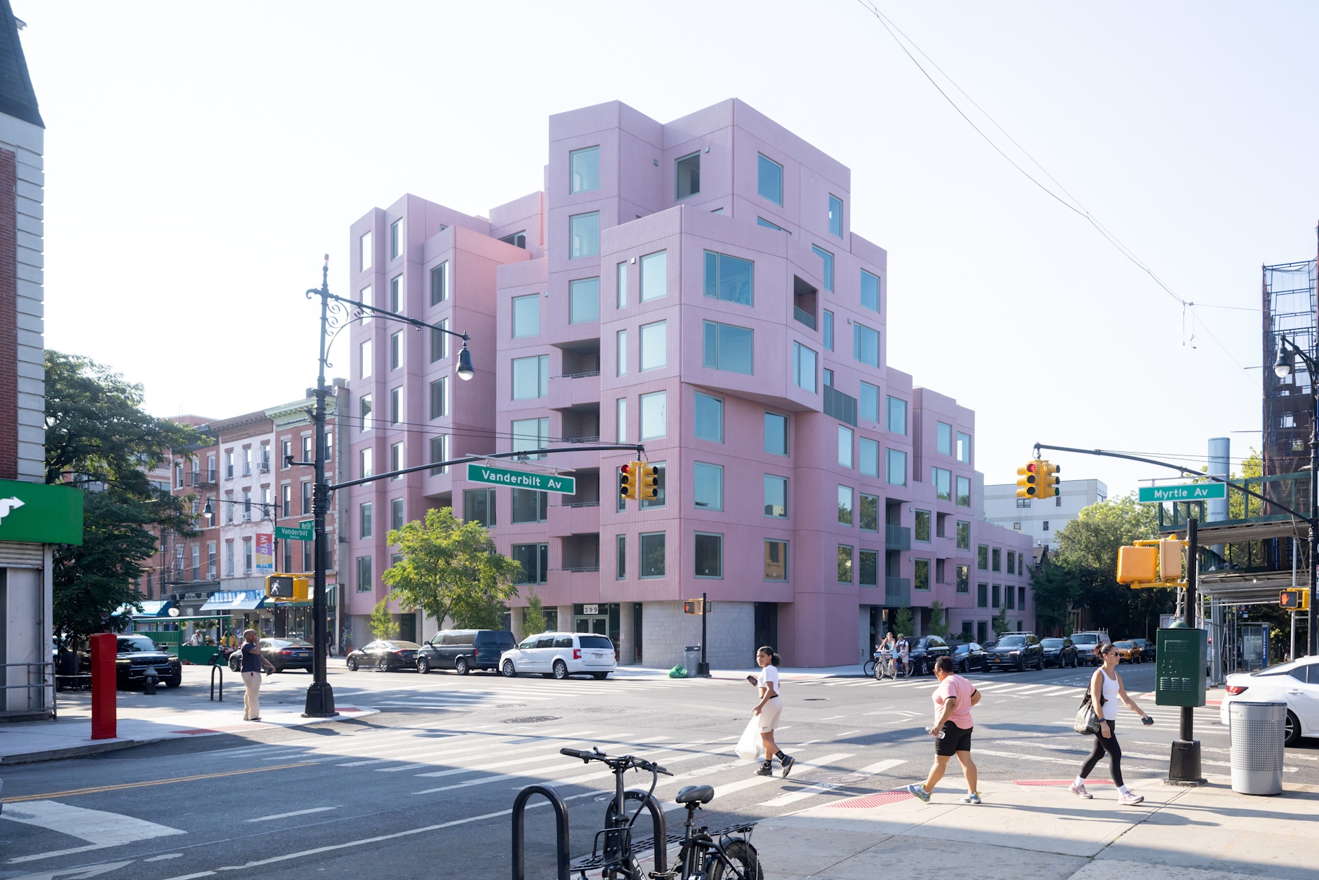 Its distinct corner location, straddling two zoning districts, heavily influences the building's structure and layout. On one side, it aligns with a row of townhouses, rising to four stories. On Myrtle Avenue, known for its commercial activity, the building expands to accommodate six residential floors above two commercial levels. The project explores these two contrasting urban experiences, creating a structure that acts as a porous barrier, housing a tranquil inner haven that contrasts with the vibrant street life.