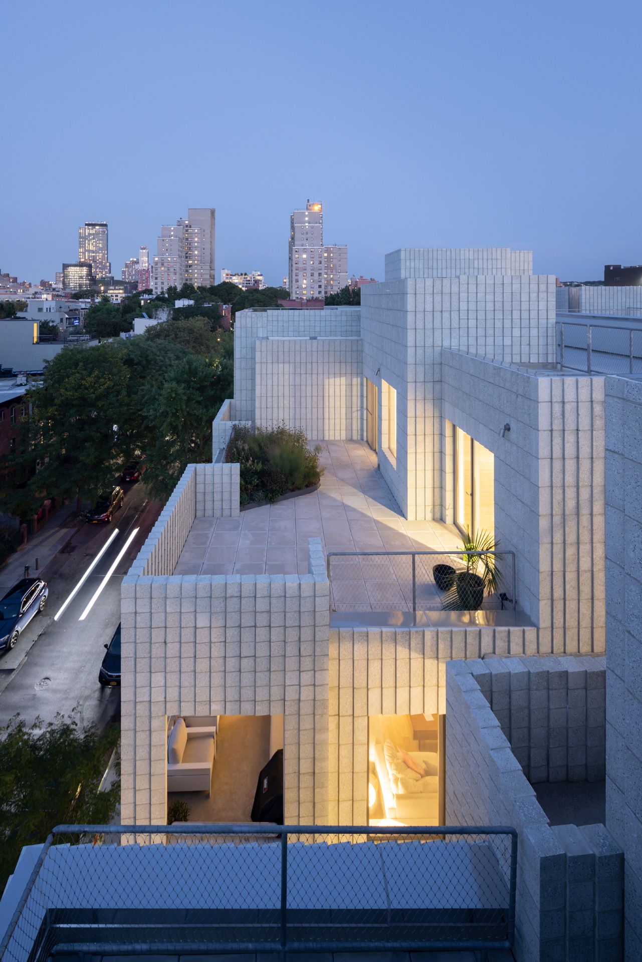 Living areas are a gradient of indoors and out, defined by their relationship to the landscape that fills the courtyards. Large terraces extend each living space outdoors. Intimate balconies create a buffer from the street for master bedrooms. Courtyards allow windows on three sides of every apartment. A mix of window sizes define atmospheres of changing natural light and framed views to courtyards and the neighborhood beyond.
