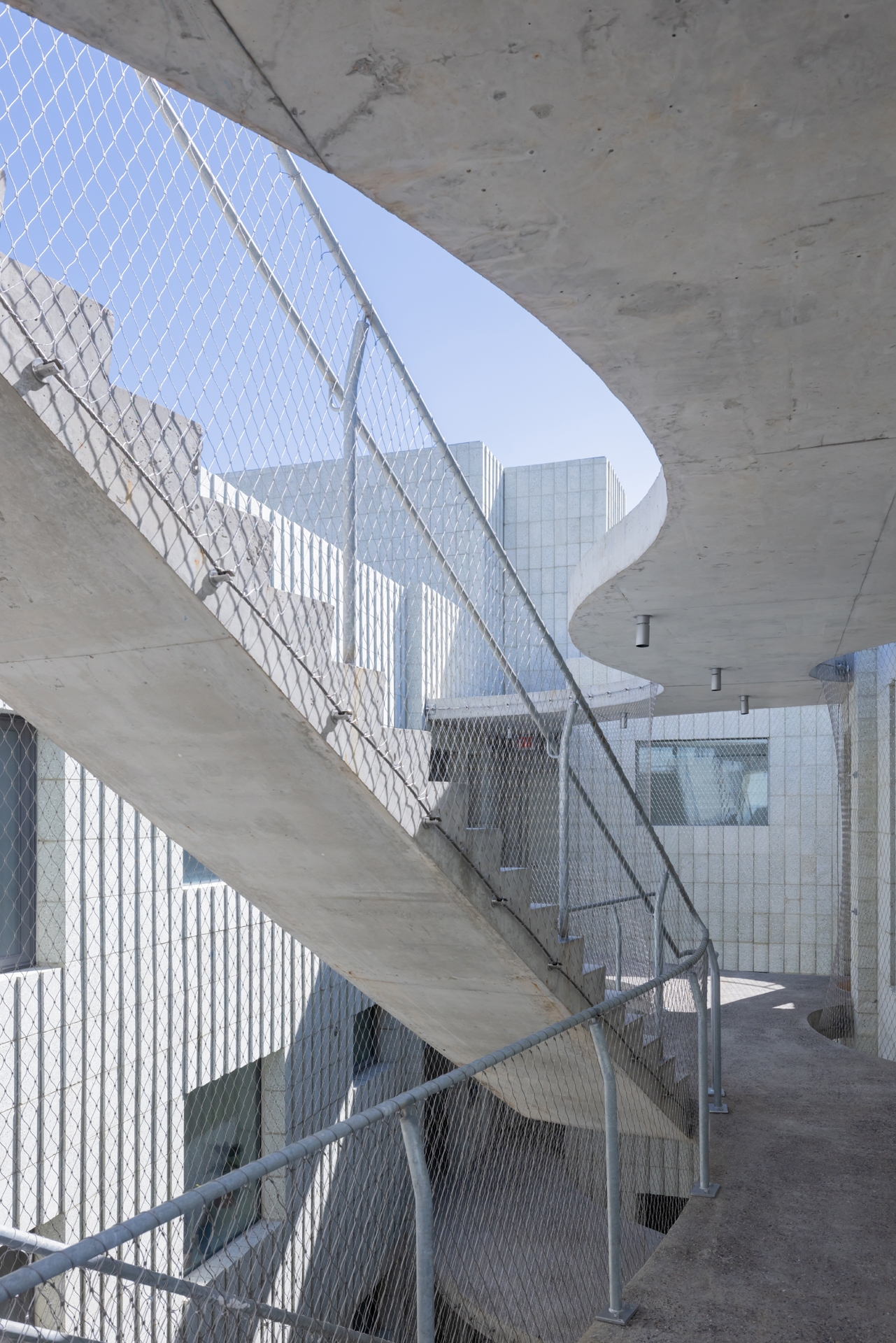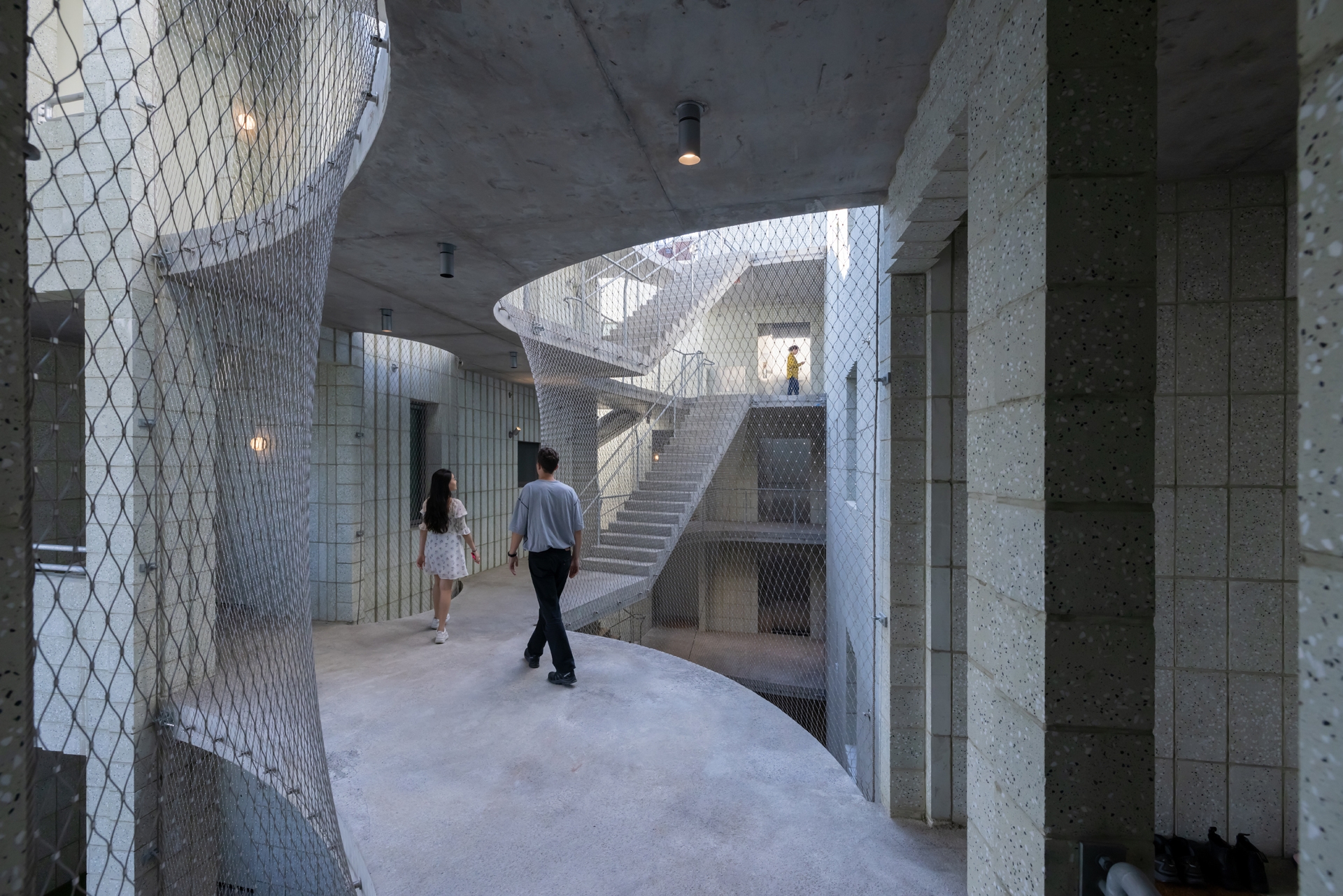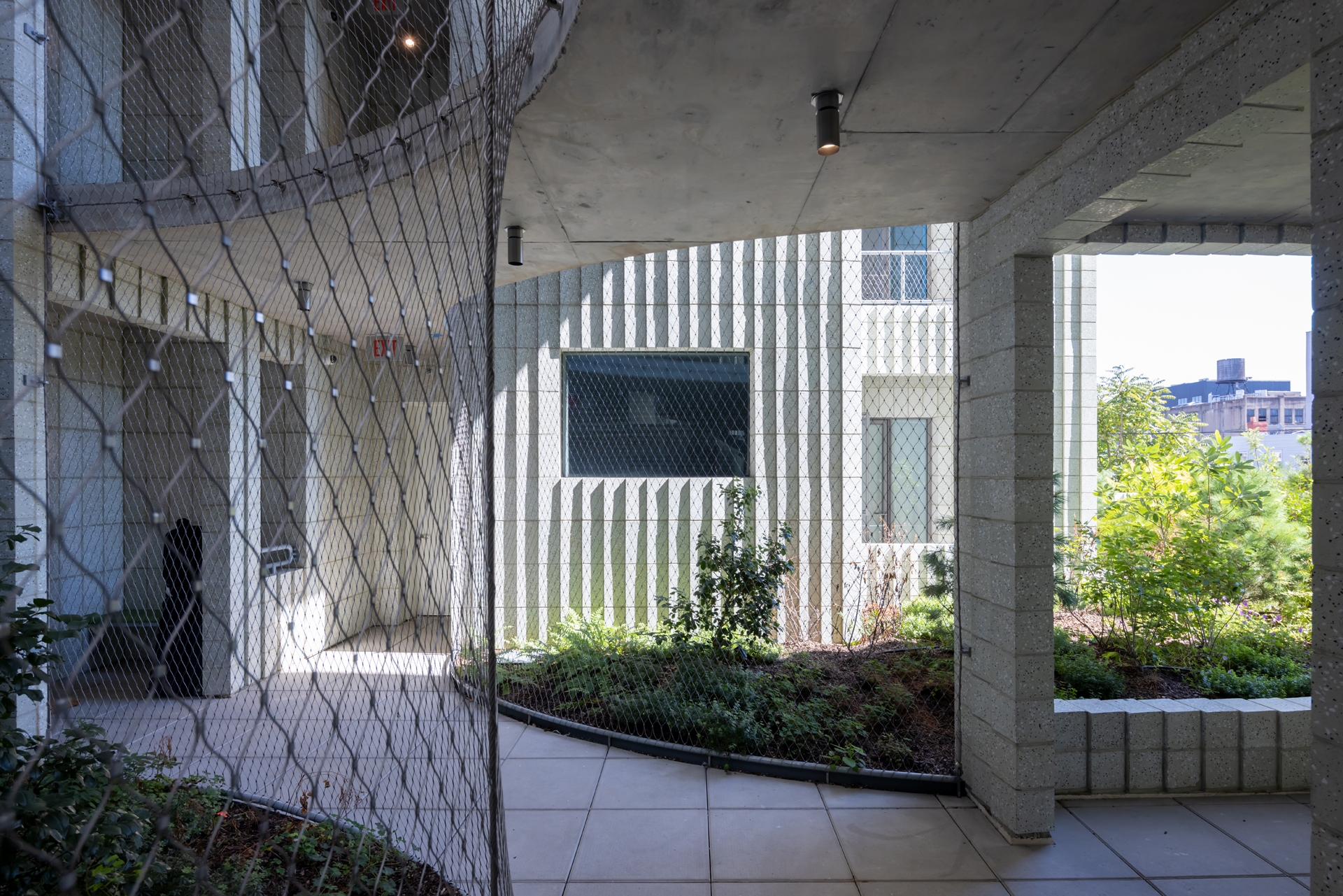 A community means shared spaces for living and relaxing together, but also informal interaction. A garden circulates the building as a hallway, corridors and stairs move outdoors. Neighbors see one another’s comings and goings across the way, and a shared entry courtyard encourages chat. Walls replaced with transparent mesh allow light and changing seasons to permeate the building’s activity.