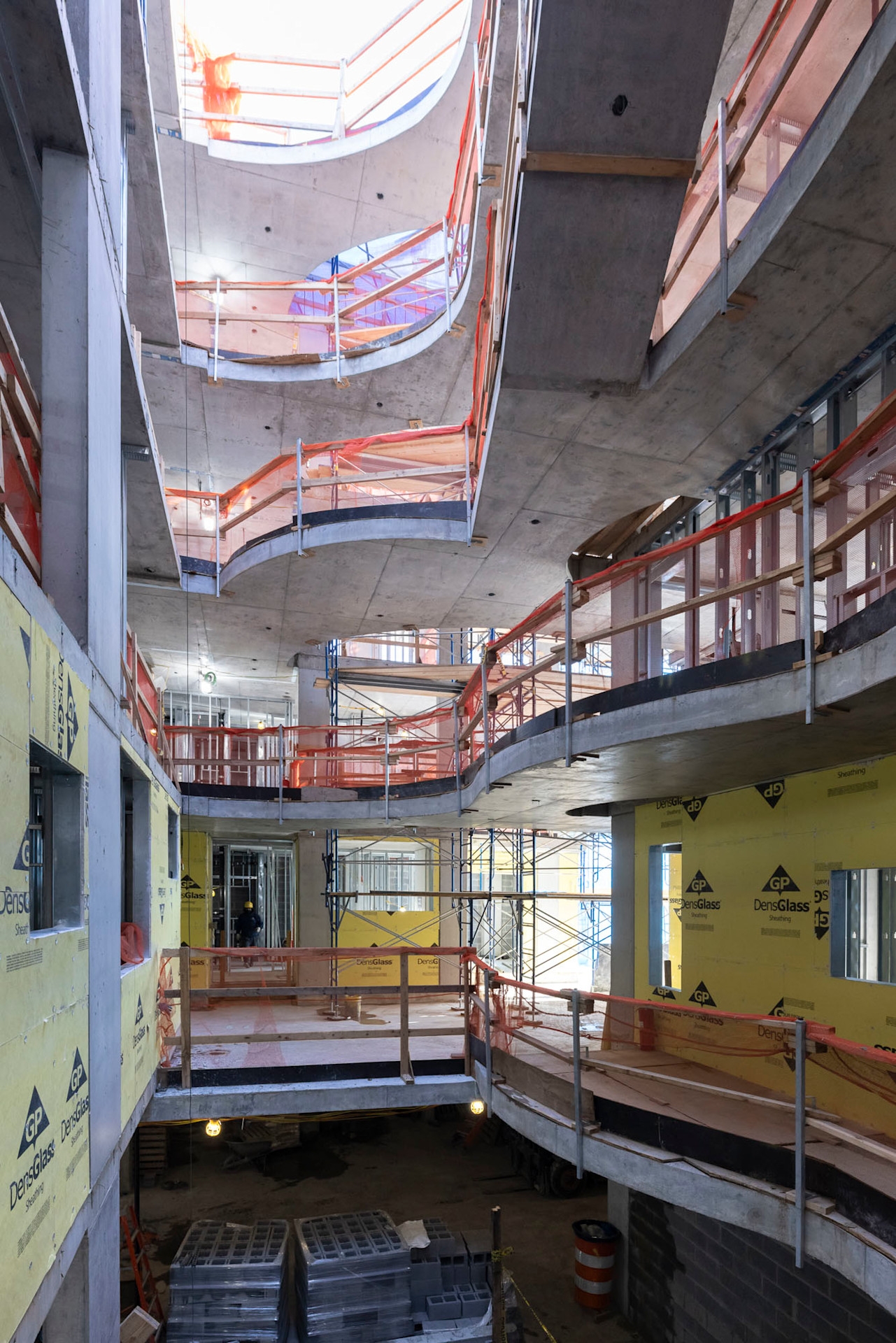 We believe open space and green make living in proximity to one another more sustainable. Three courtyards create porosity to bring light and green deep within the site. A number of smaller structures open to the street and throughout the building. Textured masonry winds around each volume and courtyard, shadows move across differing orientations to register the movement of the sun and the seasons.