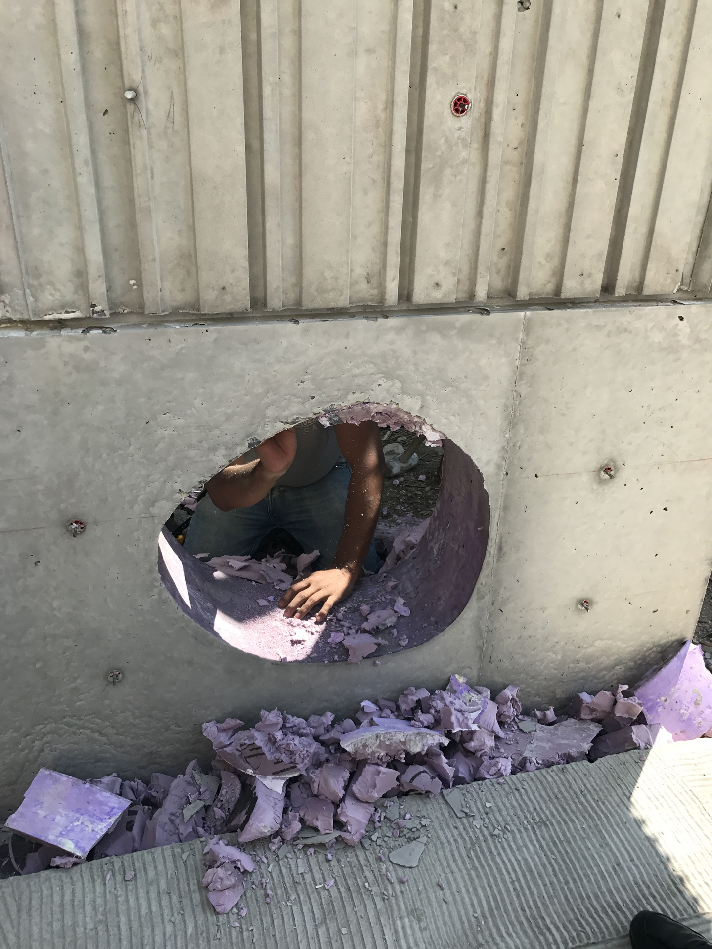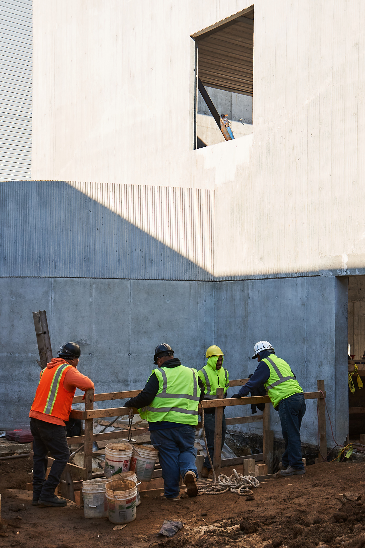 Materials render the buildings partly anonymous. Deeply textured form liners shape cast-in-plane concrete. Bricks rotate out of plane to catch a shadow. Galvanized steel bars toy with reflection and transparency. They nestle comfortably within their manufacturing and industrial storage context, and, up close, offer surprising tactilities, details, and depth that betray the familiar and the everyday.