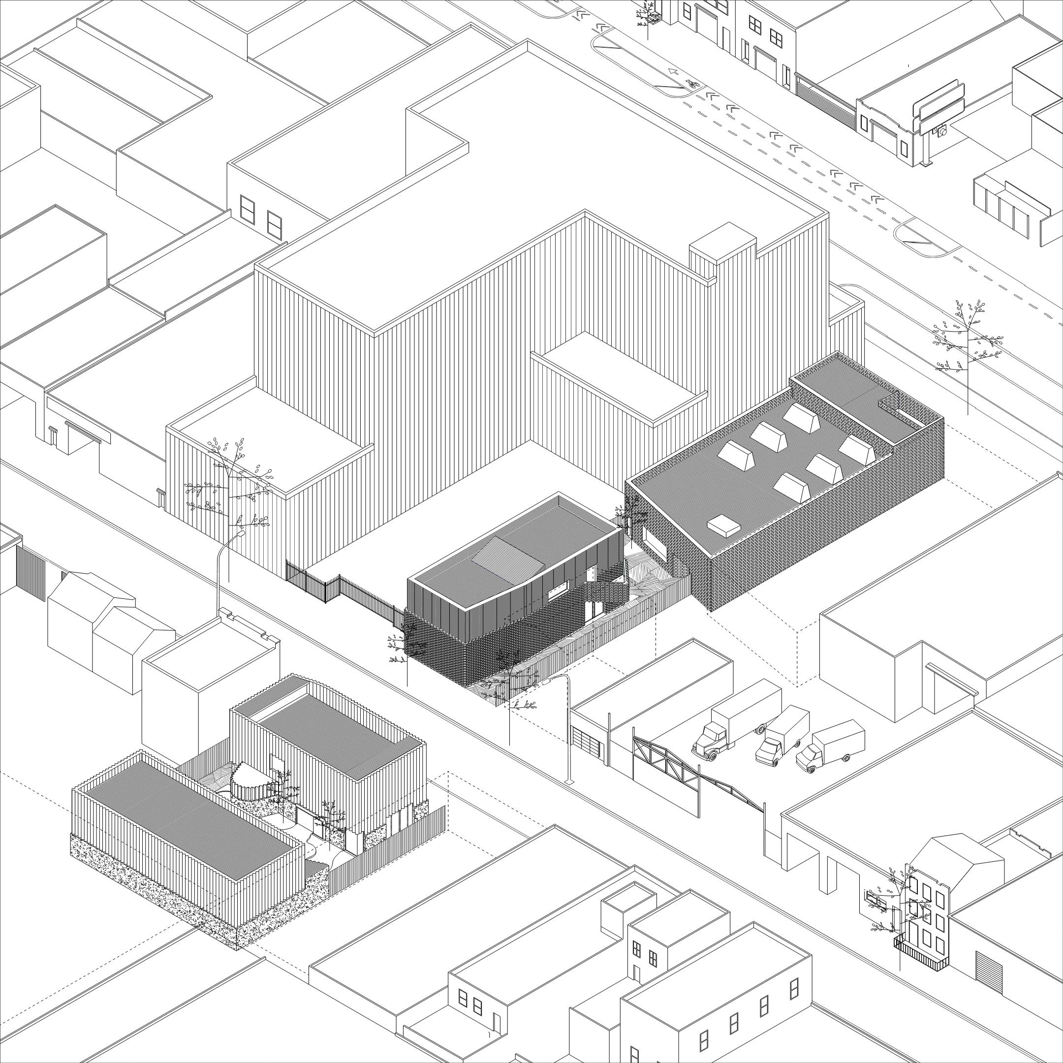 Rather than an inward-looking space isolated from its urban context, our collection of distributed volumes weaves itself into the fabric of the city. The mini-campus is a part of, benefits from, and contributes to the local community. Pockets of outdoor spaces, multiple entries, and openings cohabit the ground with other members of the neighborhood.