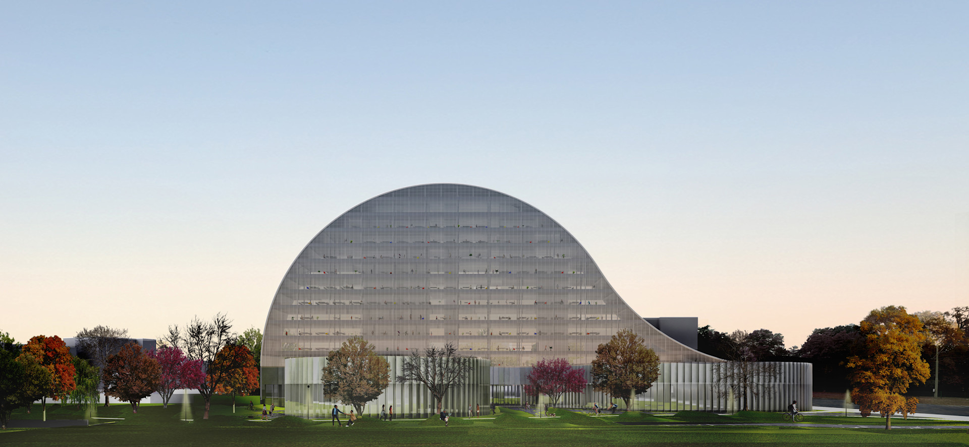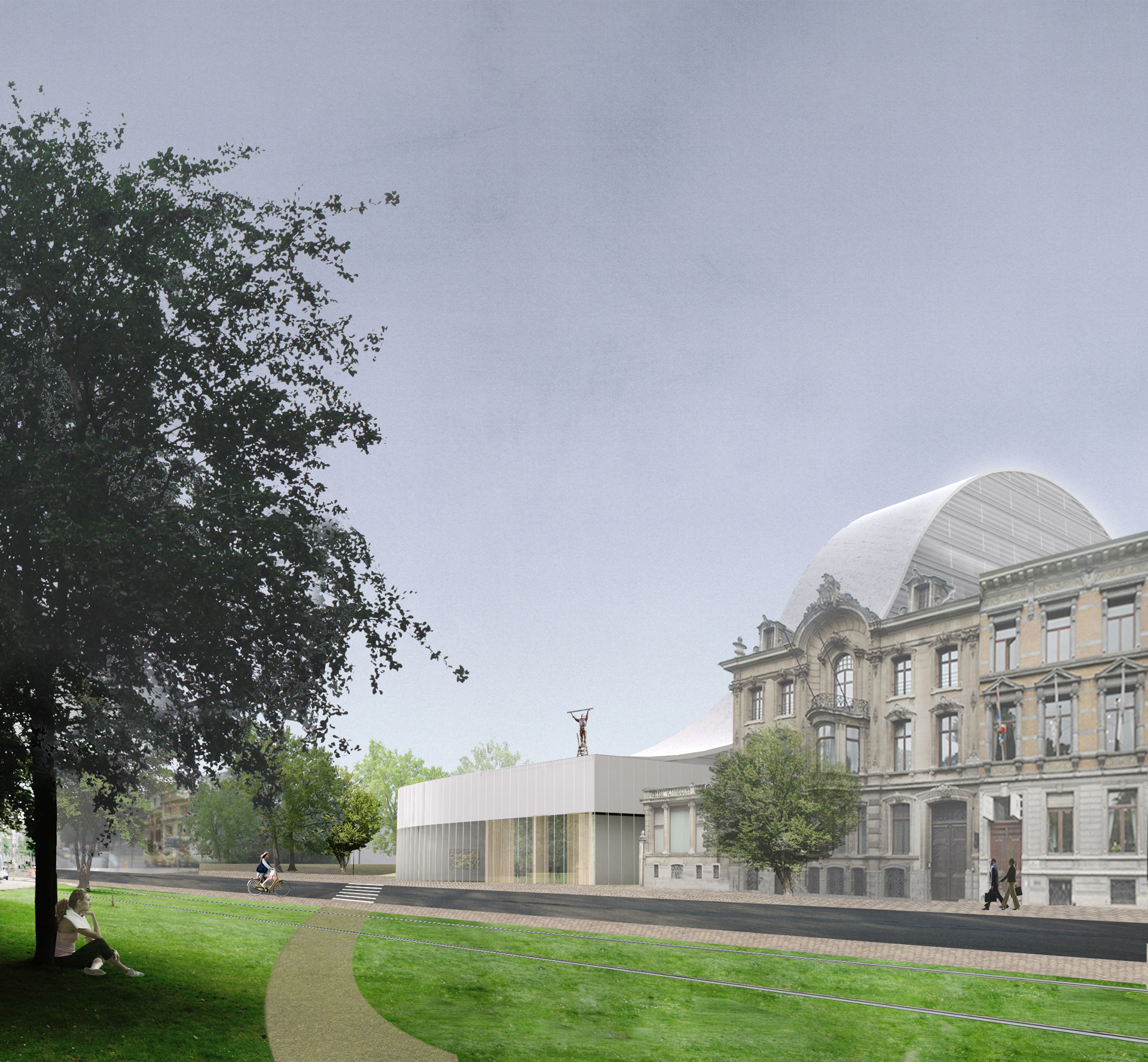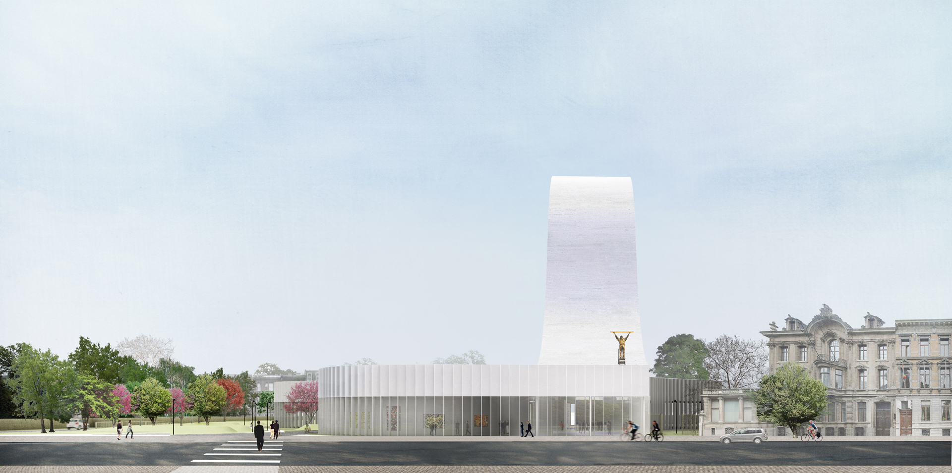 The complex is located along the Queen Elisabeth Lei, within a nineteenth century residential area between the historic city center and the ring road of Antwerp. Our proposal reshapes the modernist typology of ‘tower on plinth’ into a supple building volume that combines autonomy with connectivity. While the tower creates a strong figure as it gently rises up till 50 meters in the center of the city block, the meandering plinth firmly embeds the building within the urban morphology and defines specific realms—both interior and exterior.