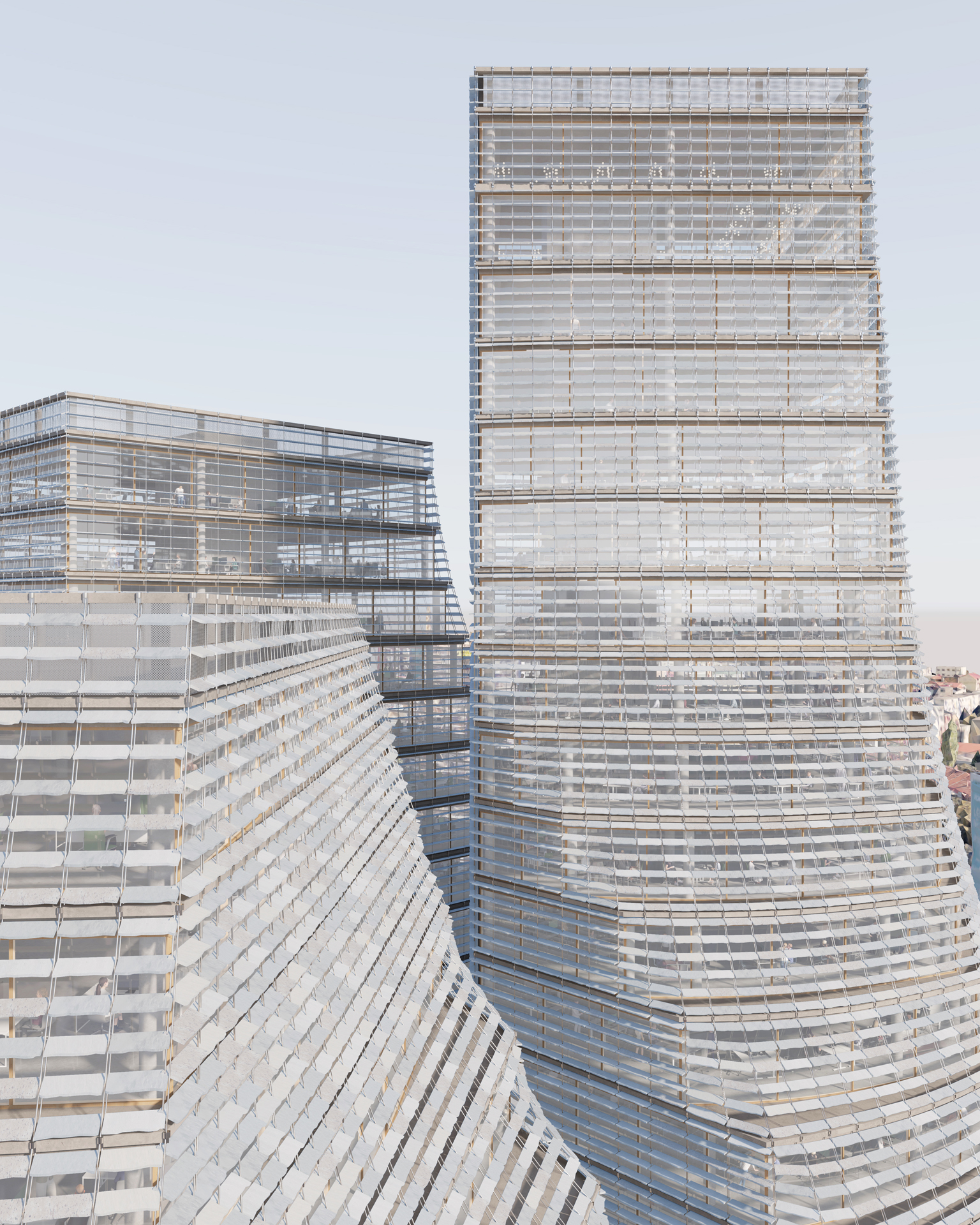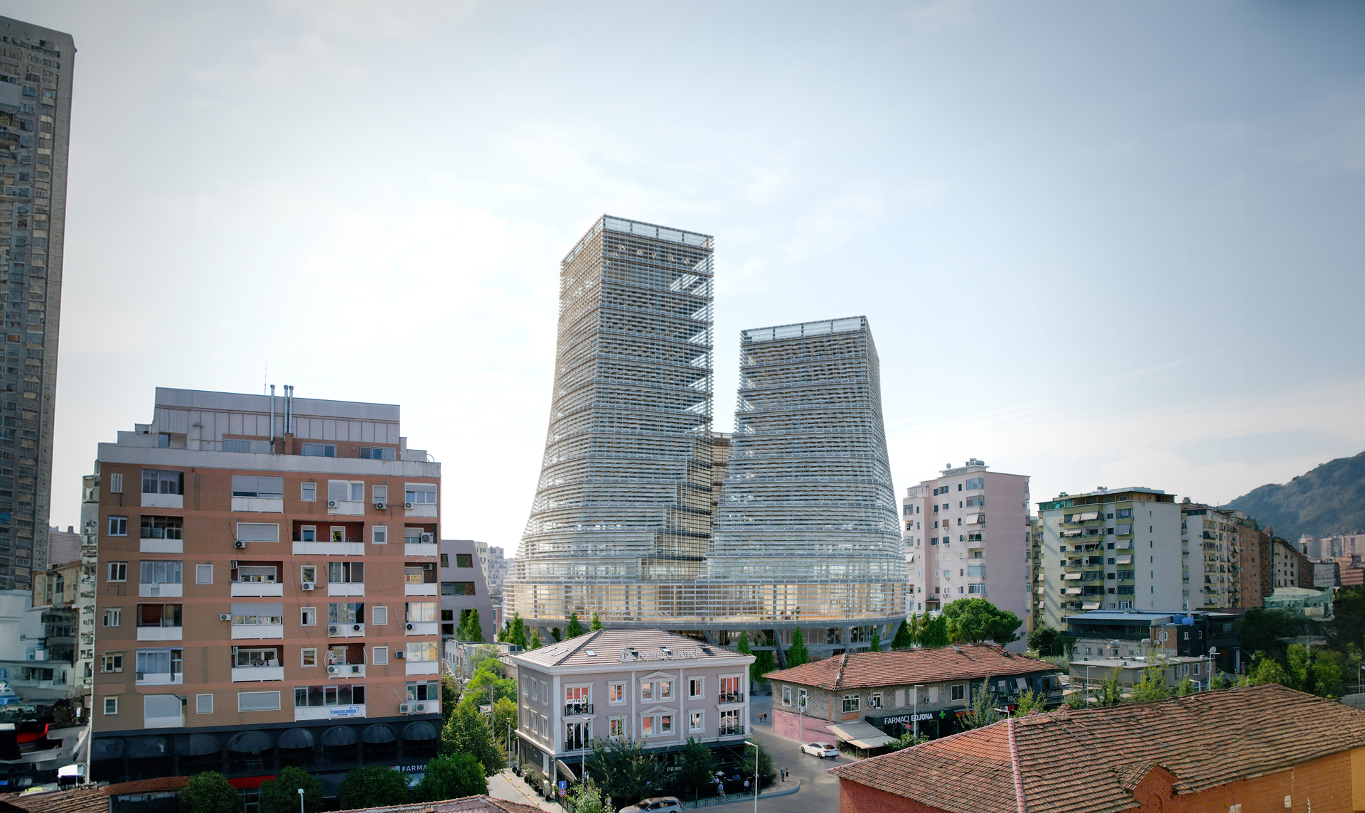An office complex in southwest Tirana consolidating 22 government institutions currently scattered across the city. The project consists of three interconnected towers above a shared plinth, providing office space, public amenities, and a central hub for collaboration.