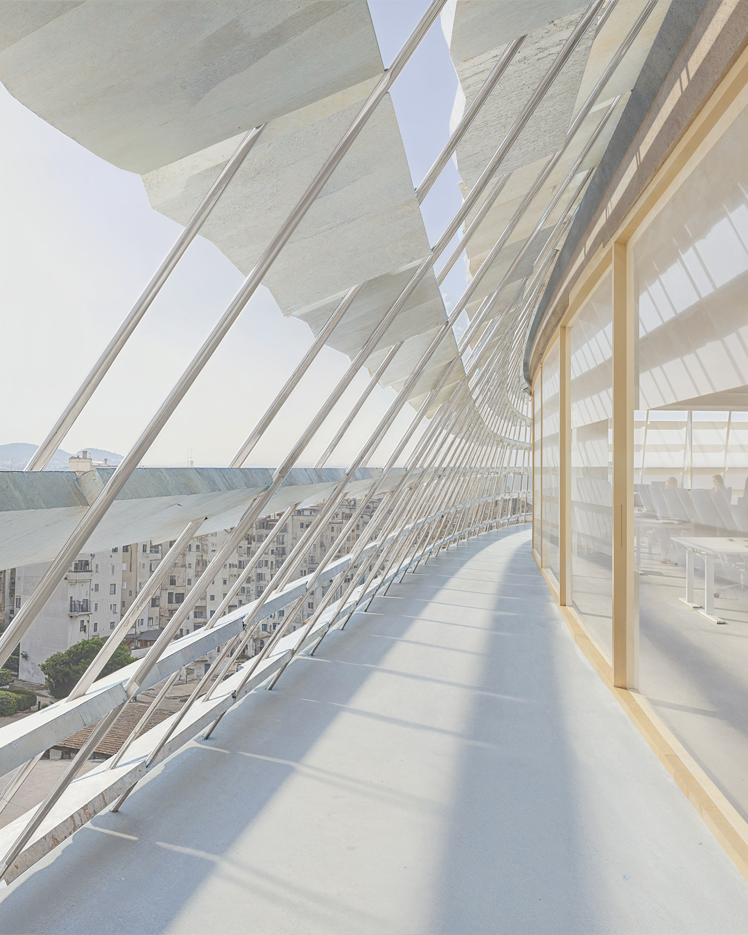 Three interconnected towers rise from a shared plinth that houses lobbies, commerce, and childcare. Linked by the elevated Chardak, the towers foster collaboration between 22 organizations, each accommodated with floor plates suited to their needs. Continuous balcony rings further strengthen exchange across agencies. At the top, collective spaces open to Tirana’s evolving skyline. Functional yet symbolic, the building embodies Albania’s progress, uniting its institutions within a civic landmark that is both contemporary and enduring.