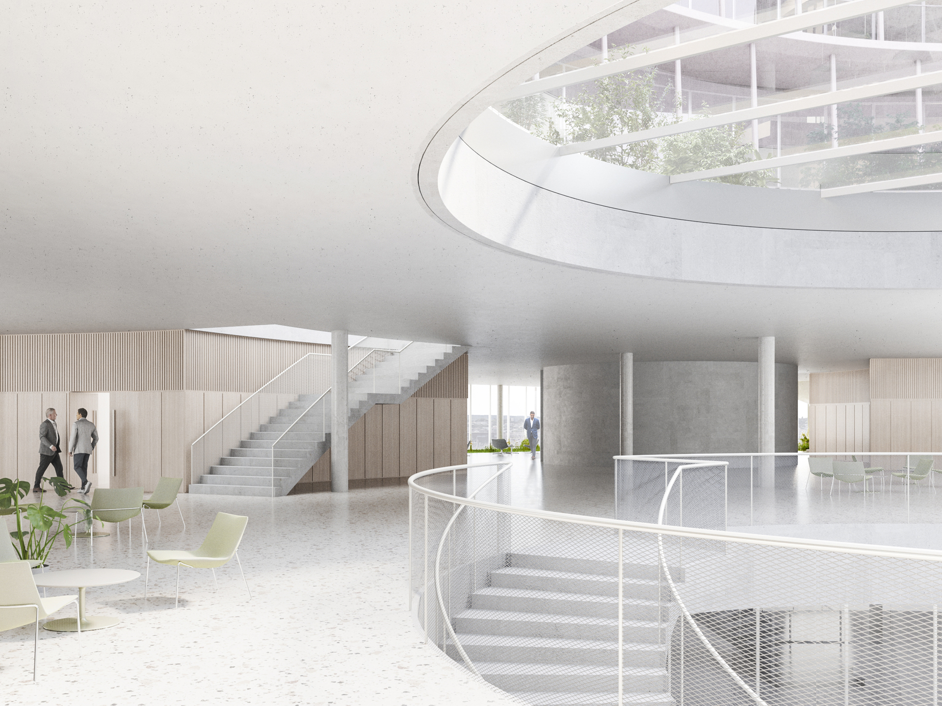 Visitors and staff are welcomed in a generous, porous and open building. The building’s facade is a dynamic play of layers and remains highly transparent, bringing daylight deep into the interior. Where it is needed, a green belt offers a visual buffer for privacy from the outside. Challenging the rectangular office floor plan, where the relationship between the perimeter and the inner zone is often static, in our plan, the relationship between center and periphery changes, resulting in a variety of spaces and avoiding the monotony of the office corridor. The result is a flexible work environment that offers a lasting sense of identity.