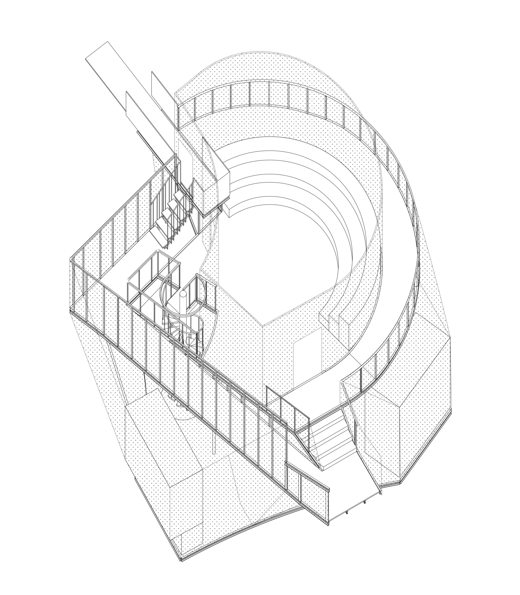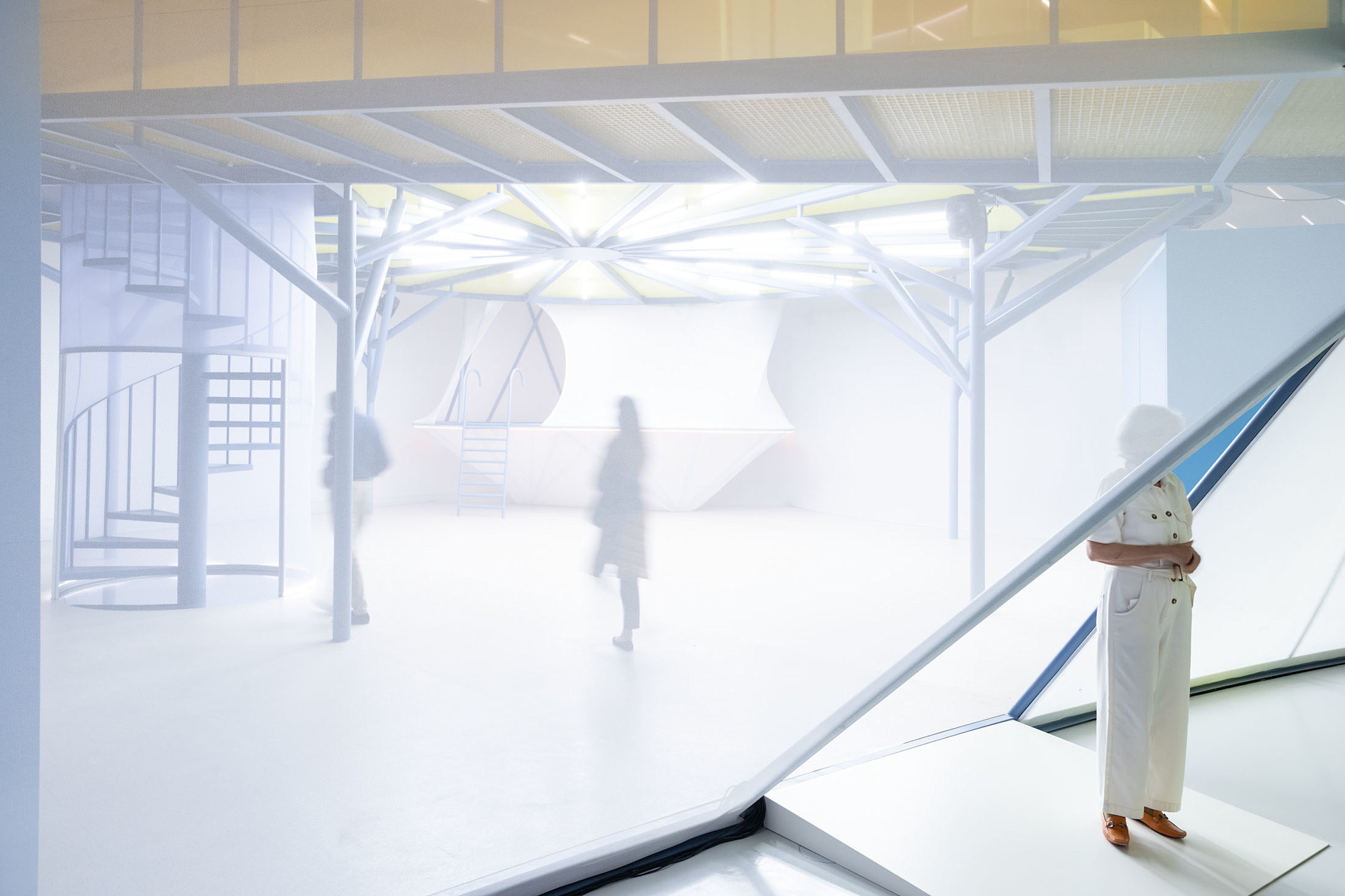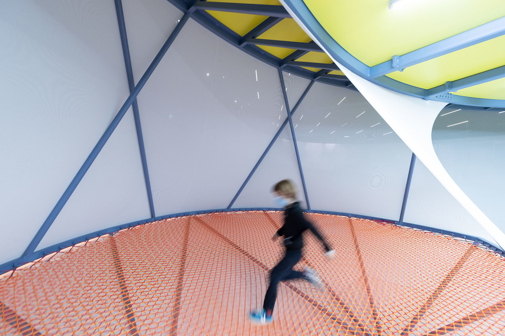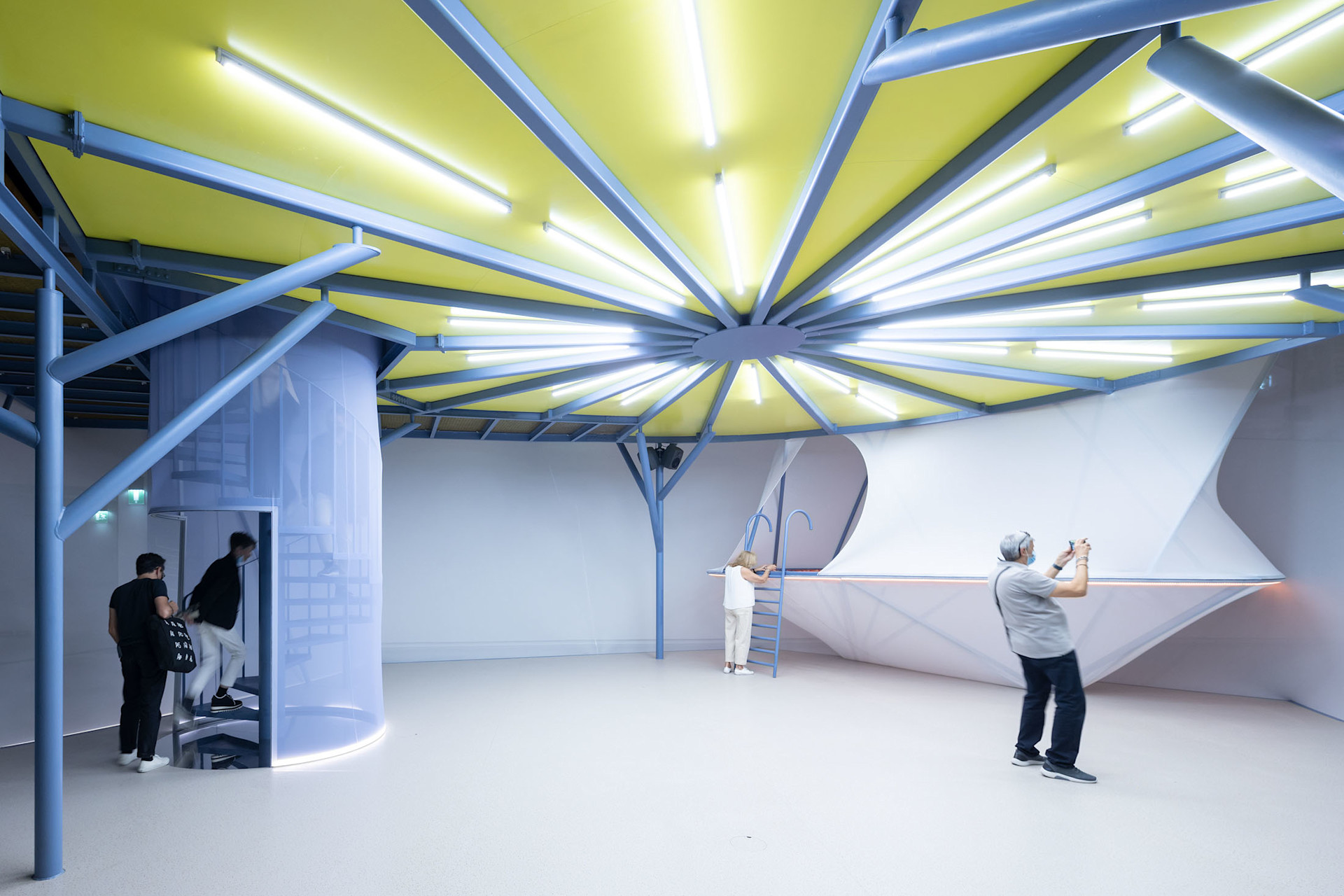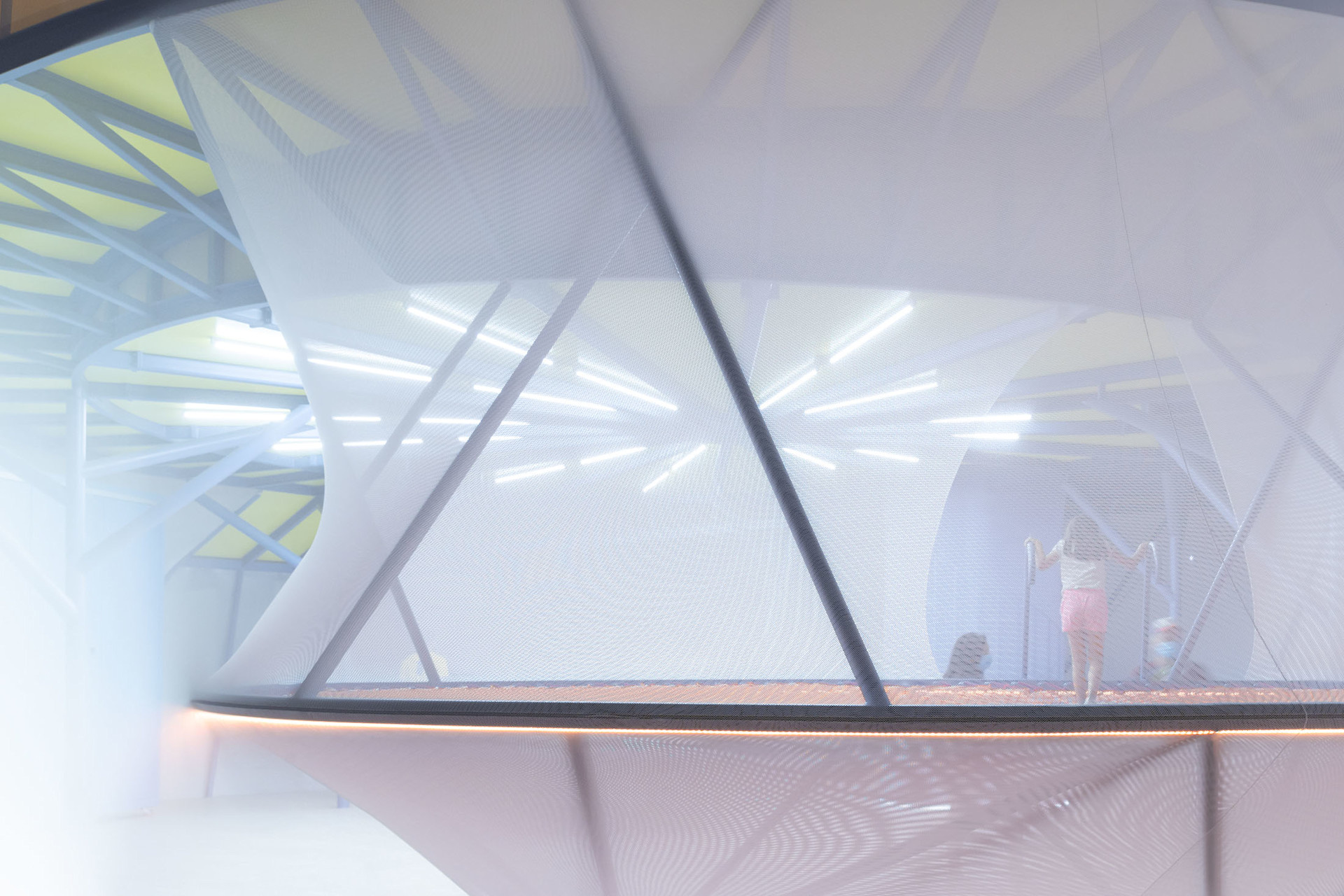 Inside the passage, an assortment of stretch fabrics of varying transparency describes spaces and opportunities for further interactions: sound capsules, video rooms, elevated pathways, stage sets, hammocks, a trampoline. The whole of the structure imbues the museum with the capacity for reciprocal experiences and encounters as a forum for discourse.