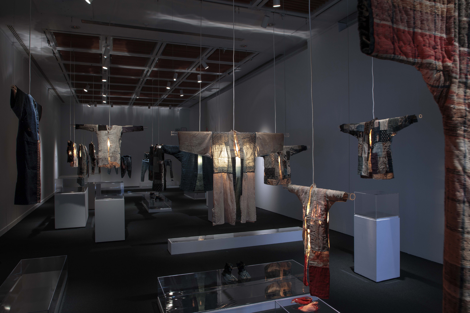Craft, artfulness, and time is visibly embedded in each piece of the collection. Through reflection, lighting and suspension techniques we amplify these qualities so that each appears not as static, inert material but as a multi-dimensional and animate. Whereas other exhibitions surface the utility and practicality of the garments, using mannequins for display, each is suspended in silence without the use of mannequins. We contrast the weight of compounded memories, represented in the textured material patchwork, with the immateriality and weightlessness of memory itself.