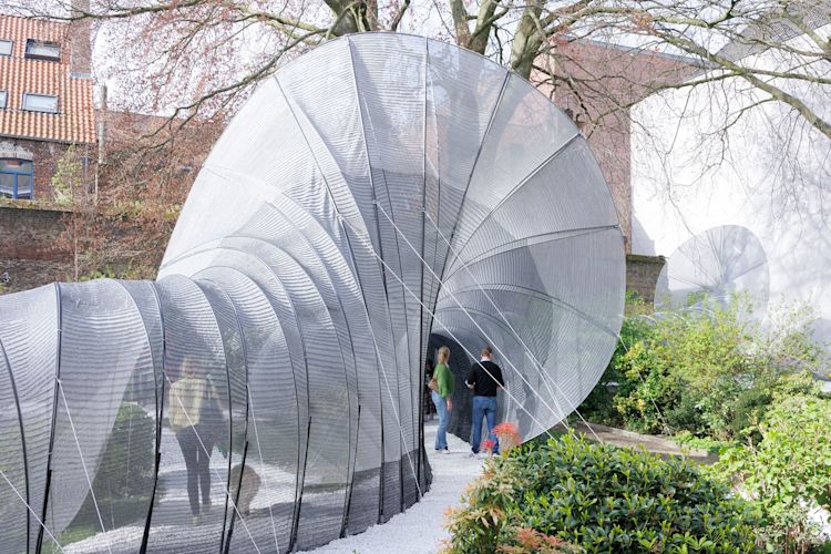 A wandering wave-like structure activates the historic space, connecting it with the streets of present-day Bruges and creating an urban conduit between districts. An unassuming entryway invites visitors to meander through playfully spiraling tunnels, ejecting them into the sunlit courtyard before guiding them to pivot and continue their journey. Once a hidden retreat, the monastery’s garden is transformed into a playground for serendipitous encounters and exploration.