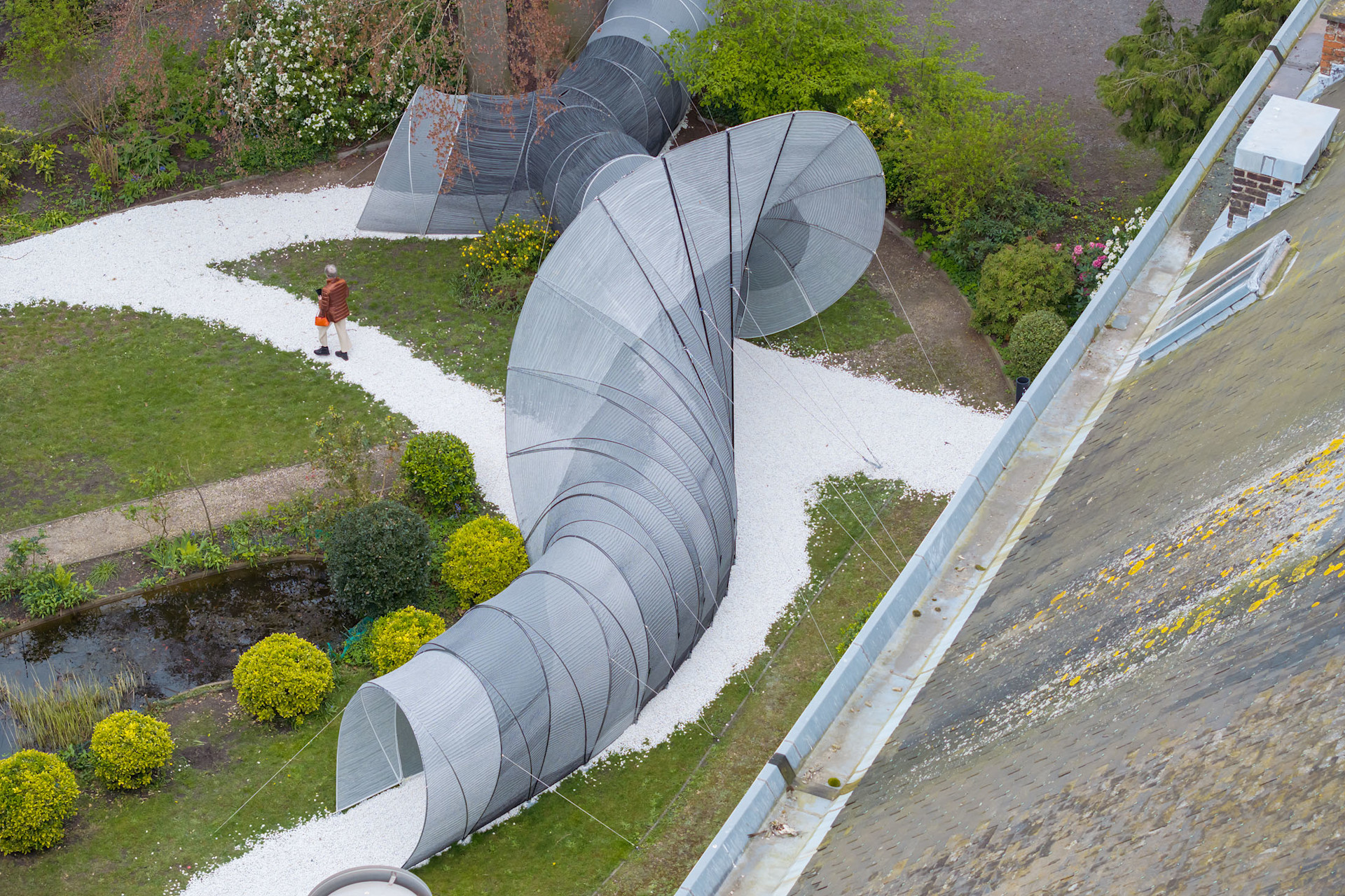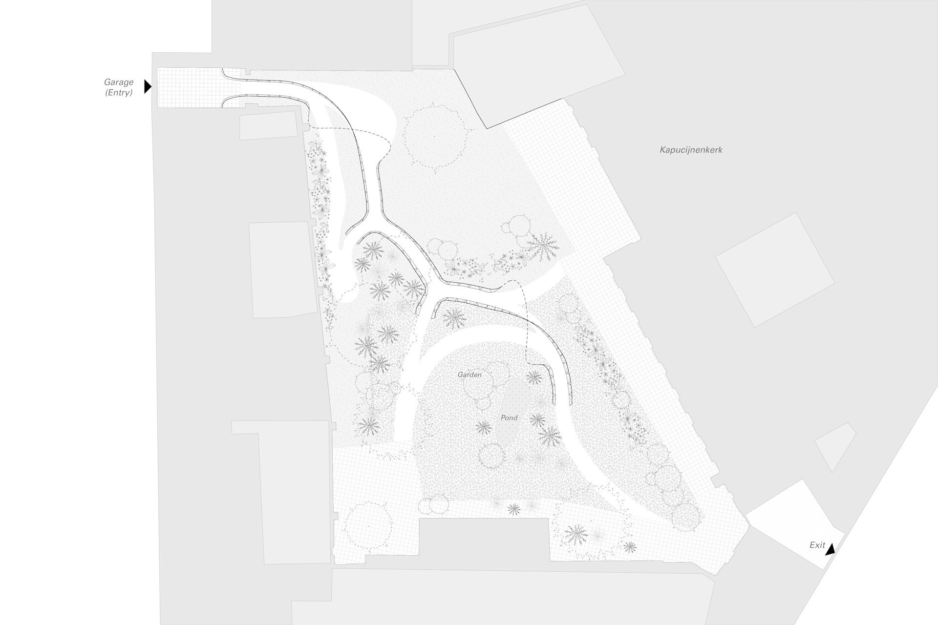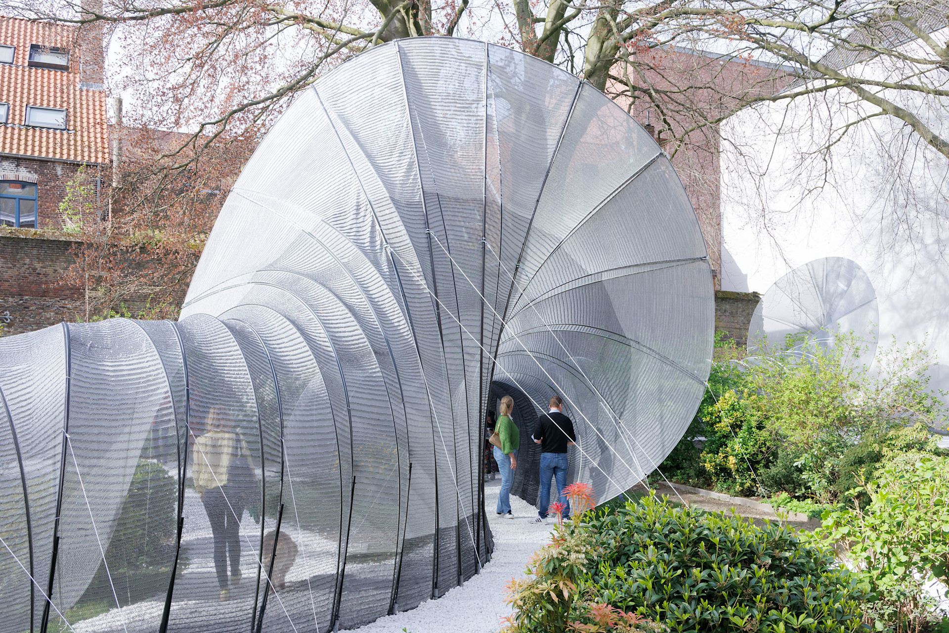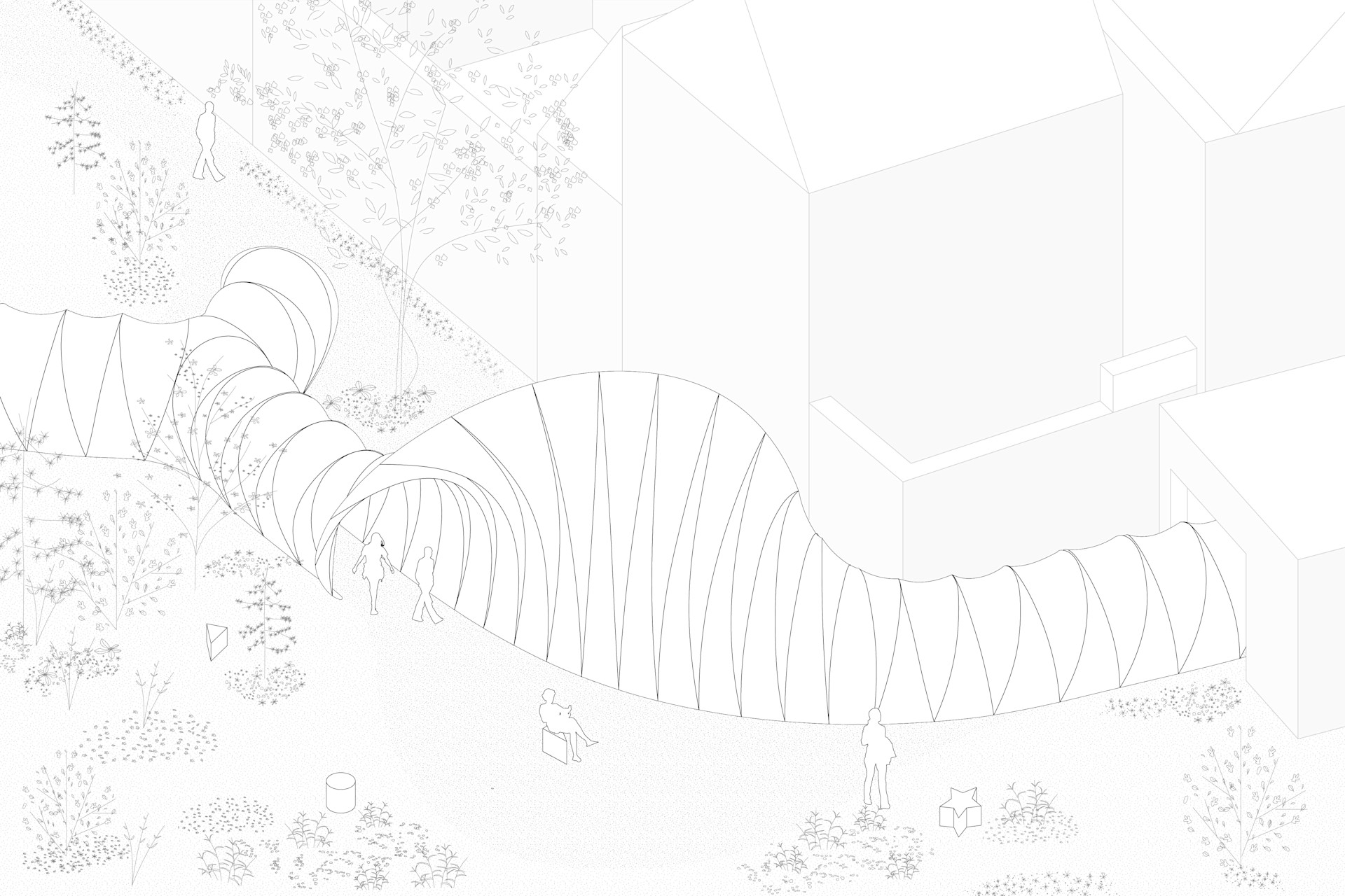 A wandering wave-like structure activates the historic space, connecting it with the streets of present-day Bruges and creating an urban conduit between districts. An unassuming entryway invites visitors to meander through playfully spiraling tunnels, ejecting them into the sunlit courtyard before guiding them to pivot and continue their journey. Once a hidden retreat, the monastery’s garden is transformed into a playground for serendipitous encounters and exploration.