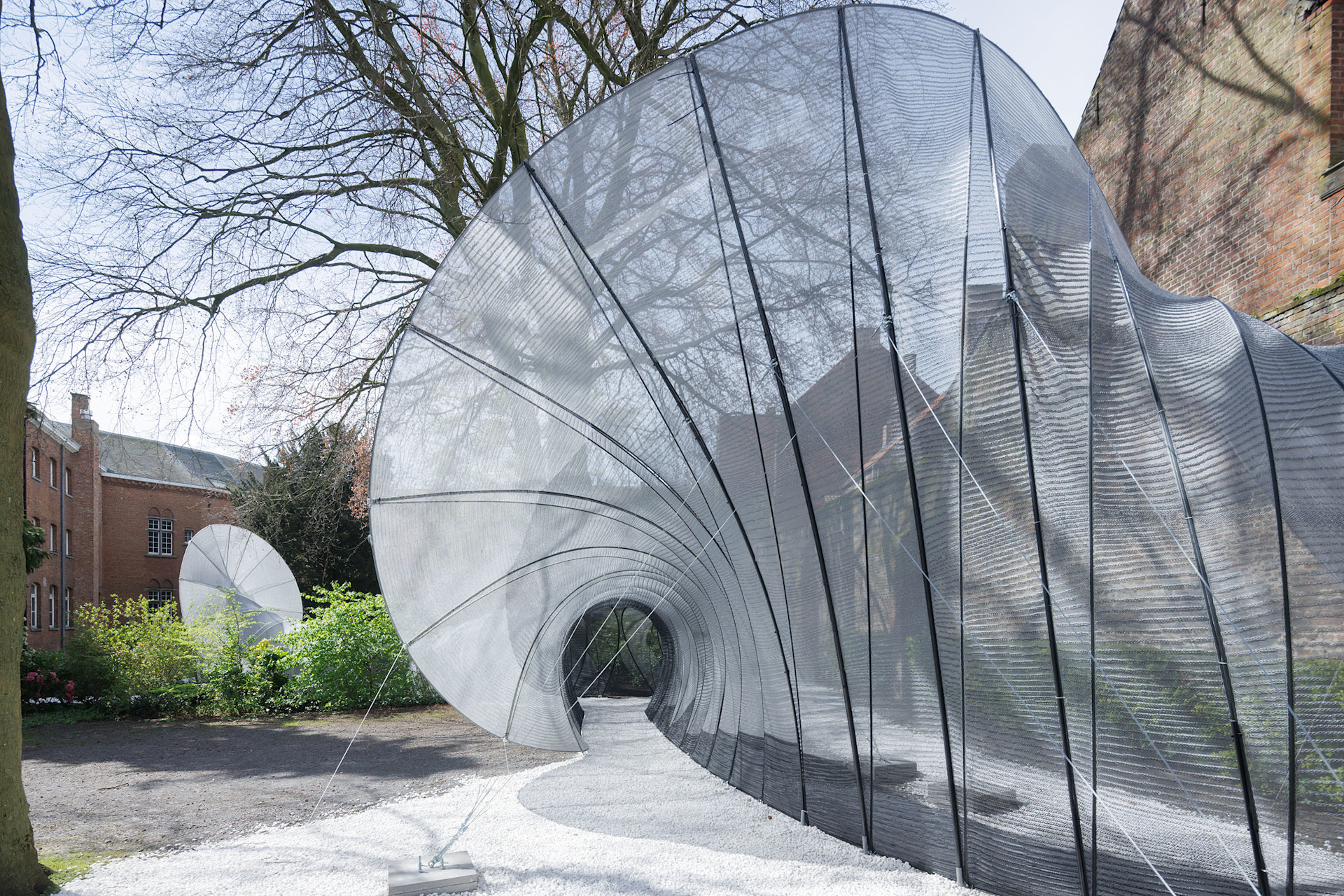 Inspired by the city's textile legacy, our installation pays homage to a centuries-old history of lace-making, and the embedded knowledge passed down by the women of Bruges through generations. The celebrated tradition of bobbin lace, still maintained in the city’s shops and ancient béguinage, inspired us to reimagine this intricate process on a different scale using modern technologies. Collaborating with Dr. Mariana Popescu and her assistant Anass Kariouh at TU Delft (and aided by a programmable 3D knitting machine) we embarked upon an exploration of the geometric possibilities unleashed by innovative fabrication techniques. The resulting fabric is knit into varying ratios, its individual threads combining and diverging into surprising, ever-changing patterns whose character is reminiscent of Hokusai’s “The Great Wave.”