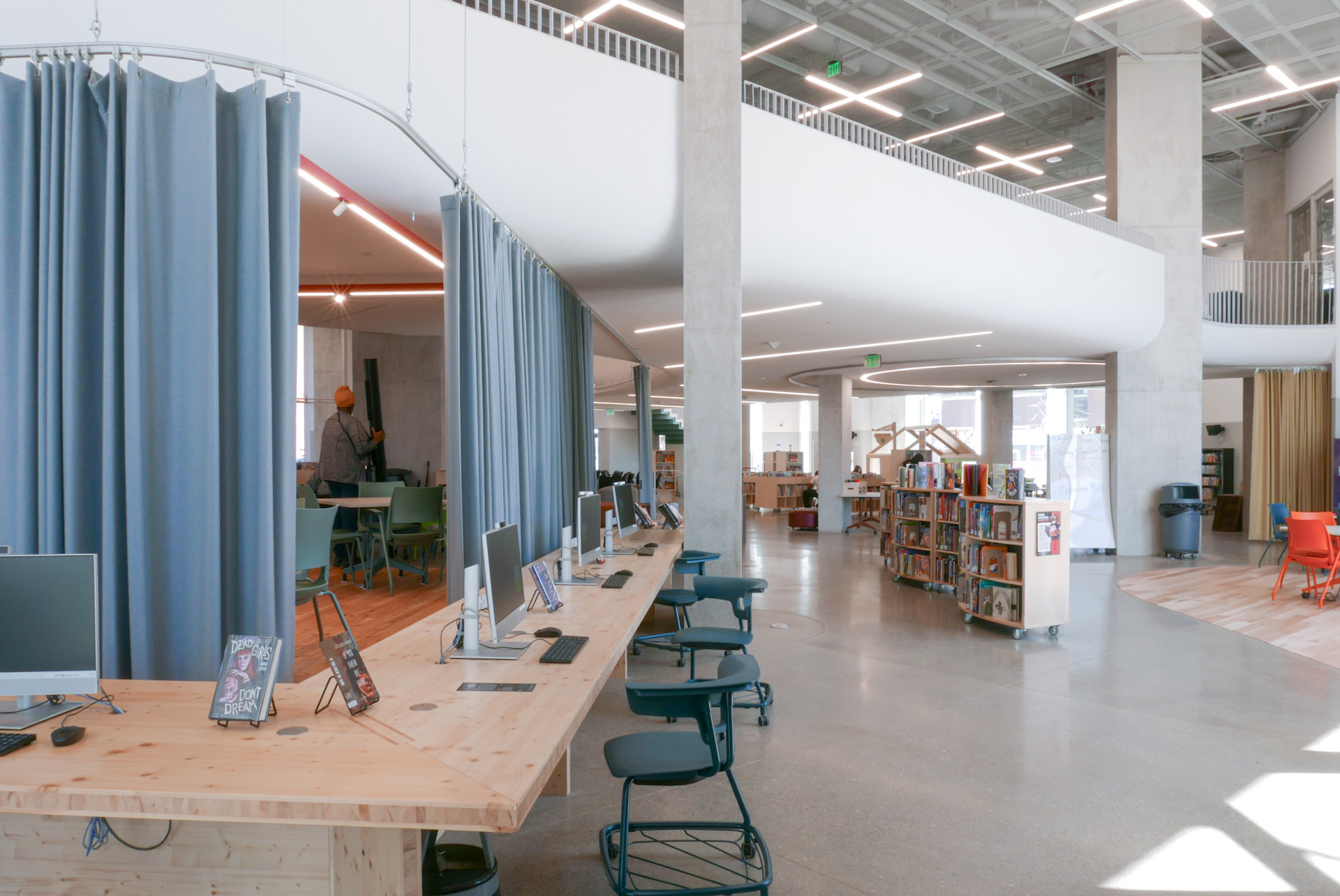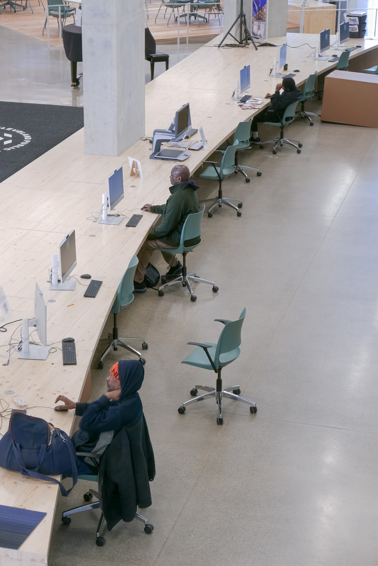 At its center, a broad, architecturally scaled table anchors the double-height main hall. Part stage, part workspace, part communal surface, it extends toward the building’s edges and adapts to different uses along its perimeter. Around it, flexible rooms accommodate meetings, children and teen activities, small-group study, and neighborhood programs. A mezzanine ring floats above the central space, providing quieter vantage points and access to special collections while maintaining visual connection to the activity below.