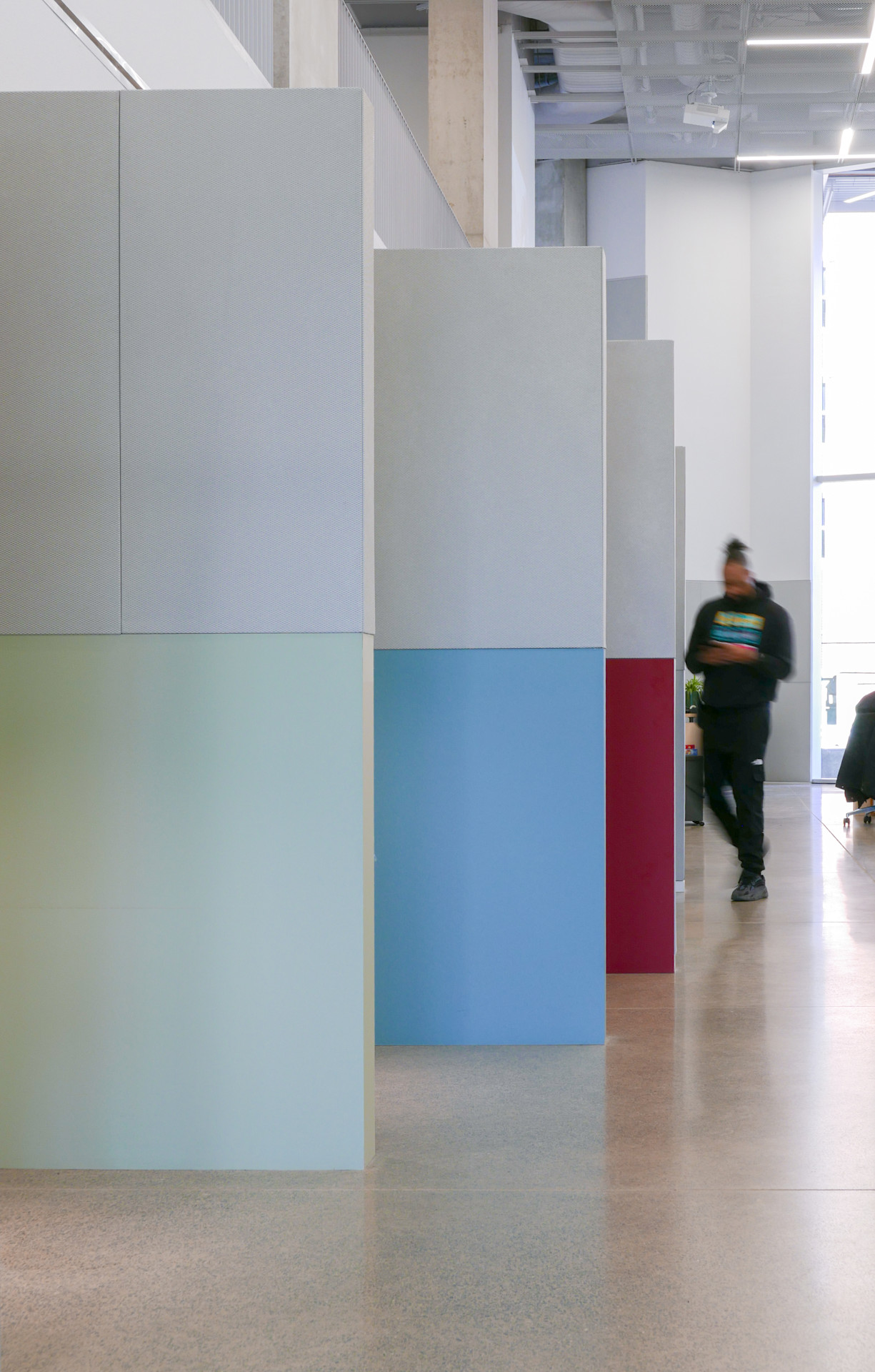 The facade wraps the building in alternating solid and glazed angled panels, producing a soft, textile-like envelope that modulates privacy and sound while drawing in calibrated daylight. From the street, the building reads as both protective and open; inside, light shifts across the interior as the day changes. A deep canopy extends the project outward, creating sheltered thresholds and encouraging the library’s functions to spill into the public realm.