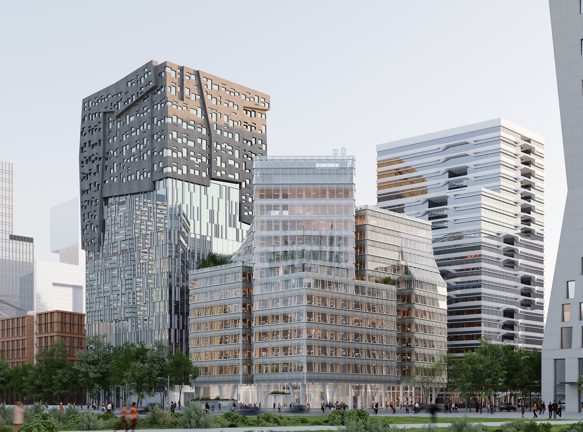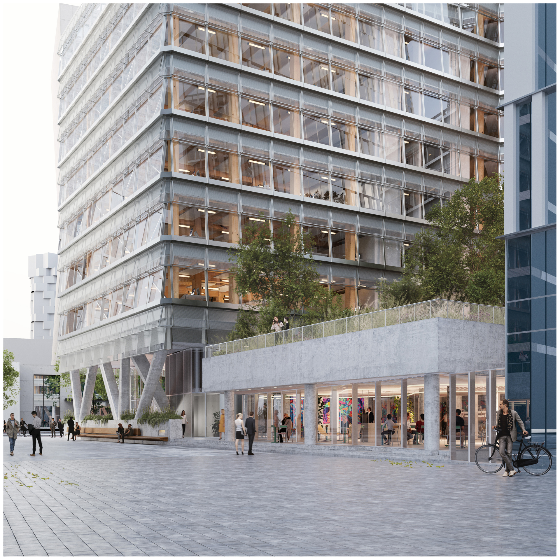 The volume is organized around a resilient structural “plinth” topped by a sustainable timber superstructure. A double-skin façade creates transitional “breathe spaces” that moderate light and climate—blurring boundaries between interior and exterior with greenery and daylight-filled buffer zones. The publicly accessible ground floor and rooftop garden further connect building users to the city and sky, fostering a porous urban relationship.