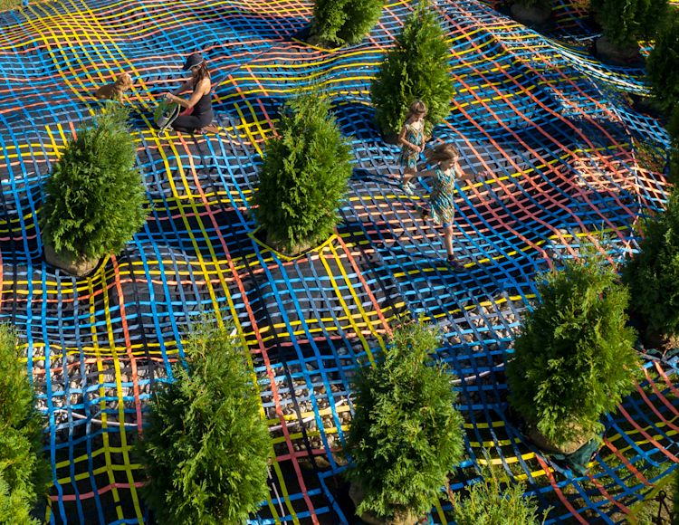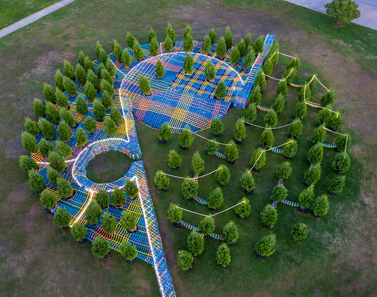 We procured 130 living Arbor Vitae trees in partnership with the Miller House and Garden, placed them on the lawn of the Bartholomew County Courthouse, and strung a large hammock structure amongst them.