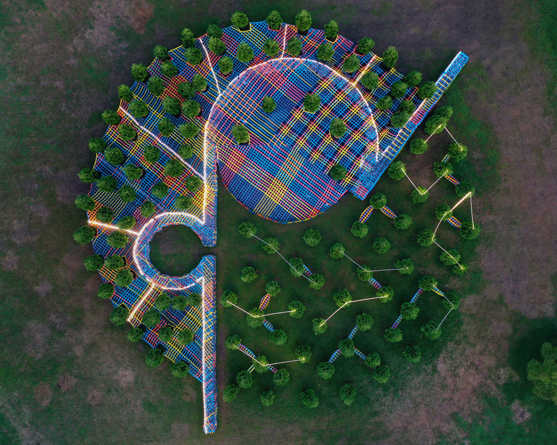 The oversized hammock was made by hand with nylon webbing – in colors taken from the color palette Alexander Girard developed for the dining chairs at the Miller House. Simple, off-the-shelf agricultural and construction materials were used for other components of the installation to ensure that everything could have a life afterward. The gabions, mulch, limestone, and stakes that comprise the planters and central pathway were all recycled into local infrastructure projects.