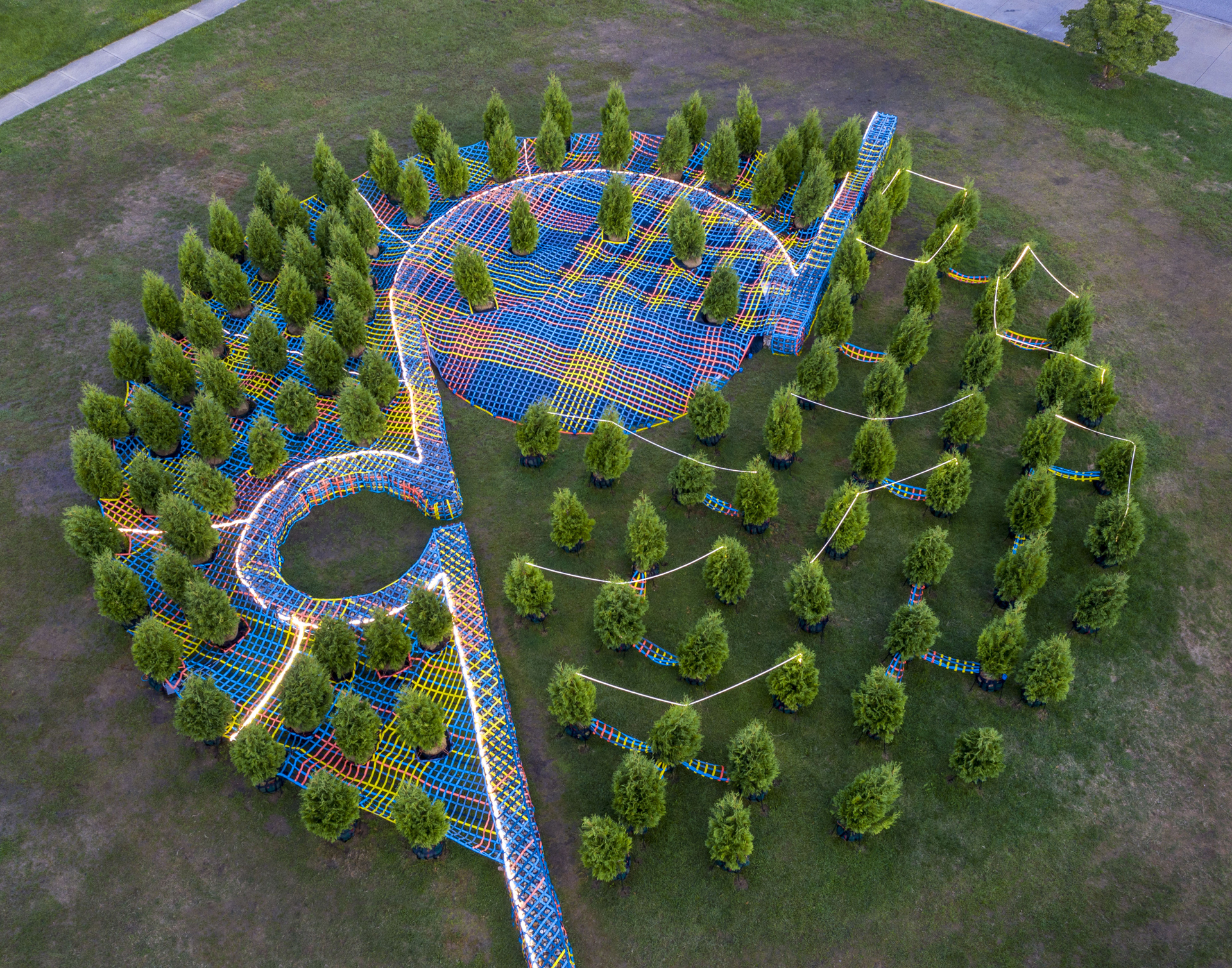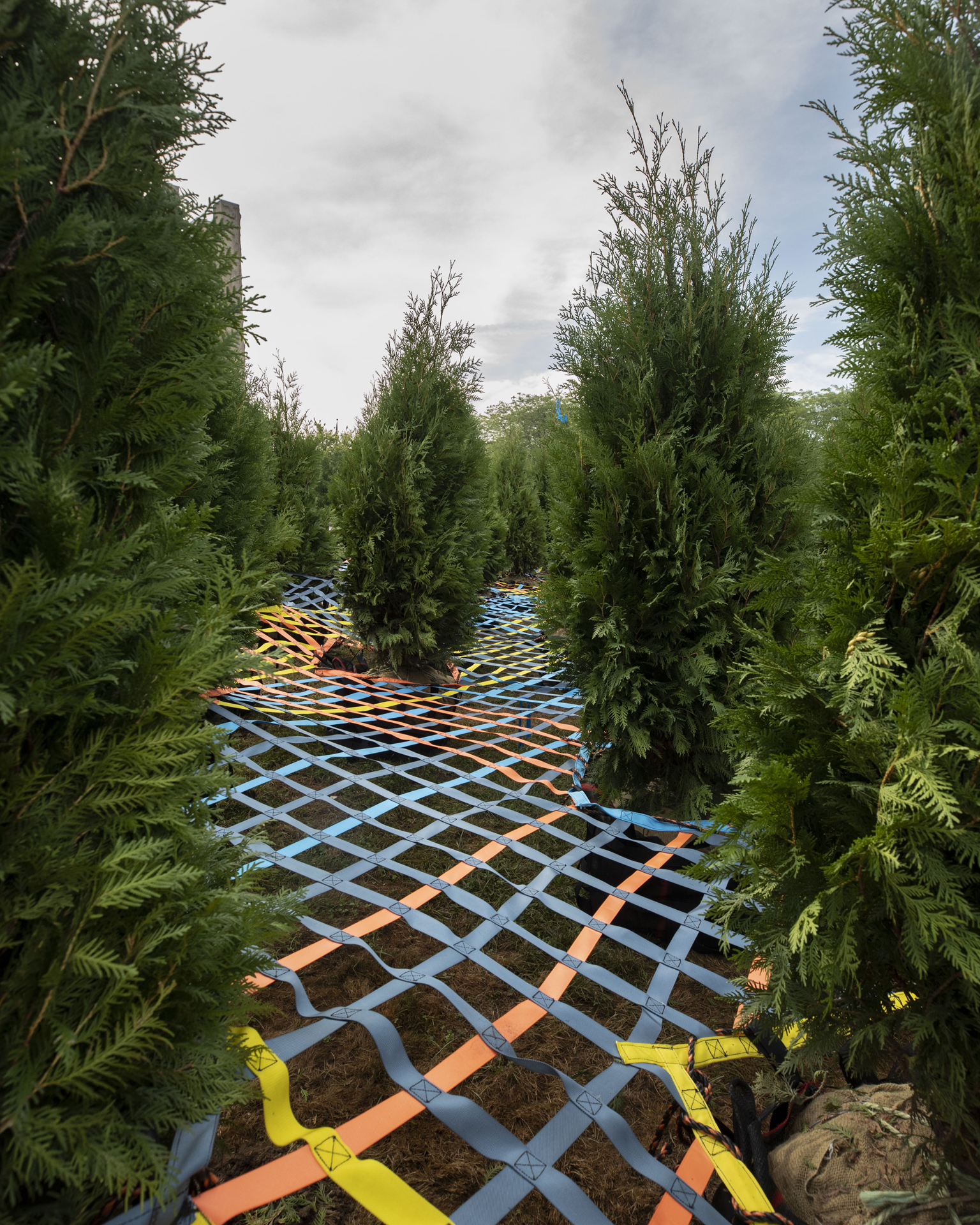 We procured 130 living Arbor Vitae trees in partnership with the Miller House and Garden, placed them on the lawn of the Bartholomew County Courthouse, and strung a large hammock structure amongst them.