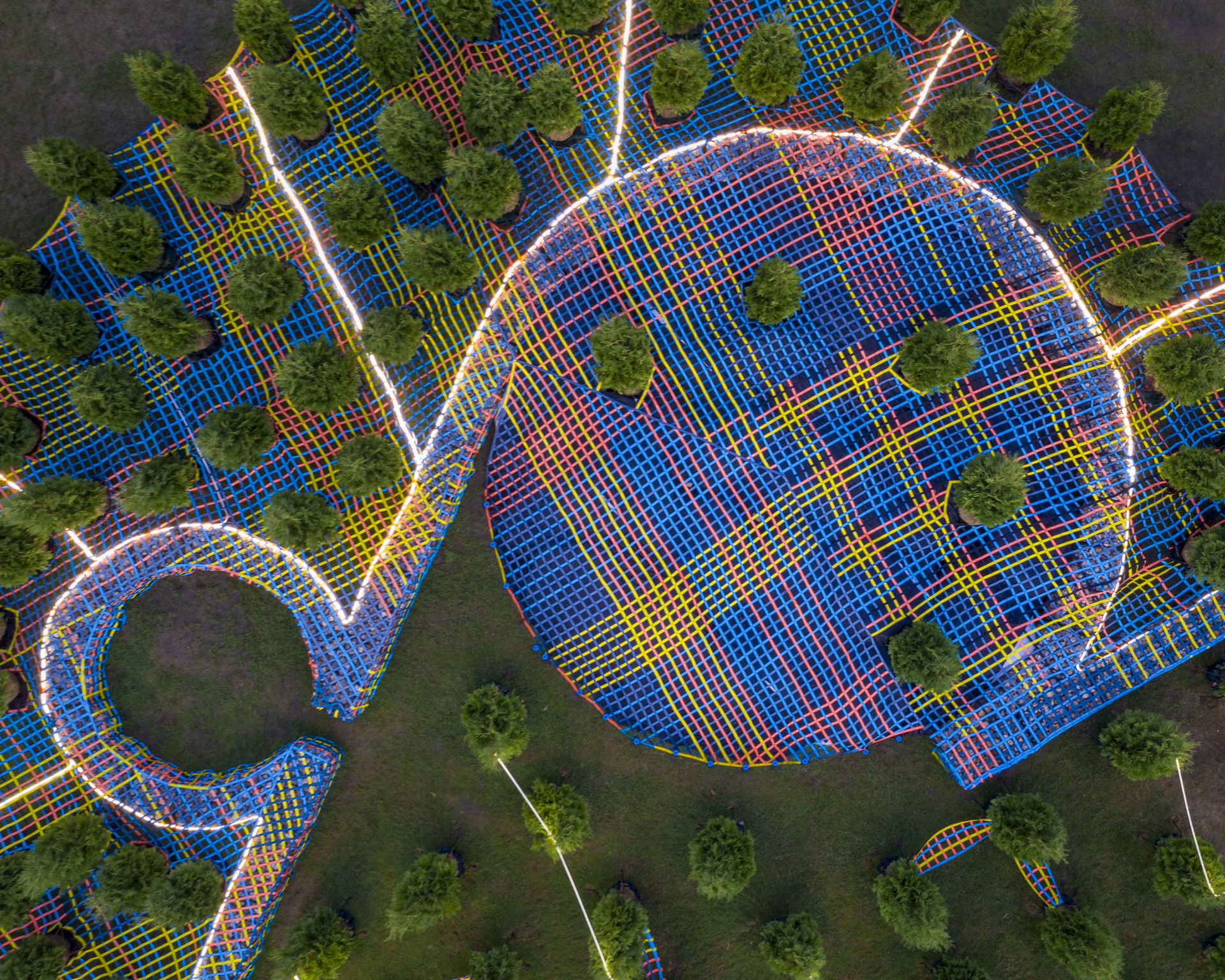 The oversized hammock was made by hand with nylon webbing – in colors taken from the color palette Alexander Girard developed for the dining chairs at the Miller House. Simple, off-the-shelf agricultural and construction materials were used for other components of the installation to ensure that everything could have a life afterward. The gabions, mulch, limestone, and stakes that comprise the planters and central pathway were all recycled into local infrastructure projects.