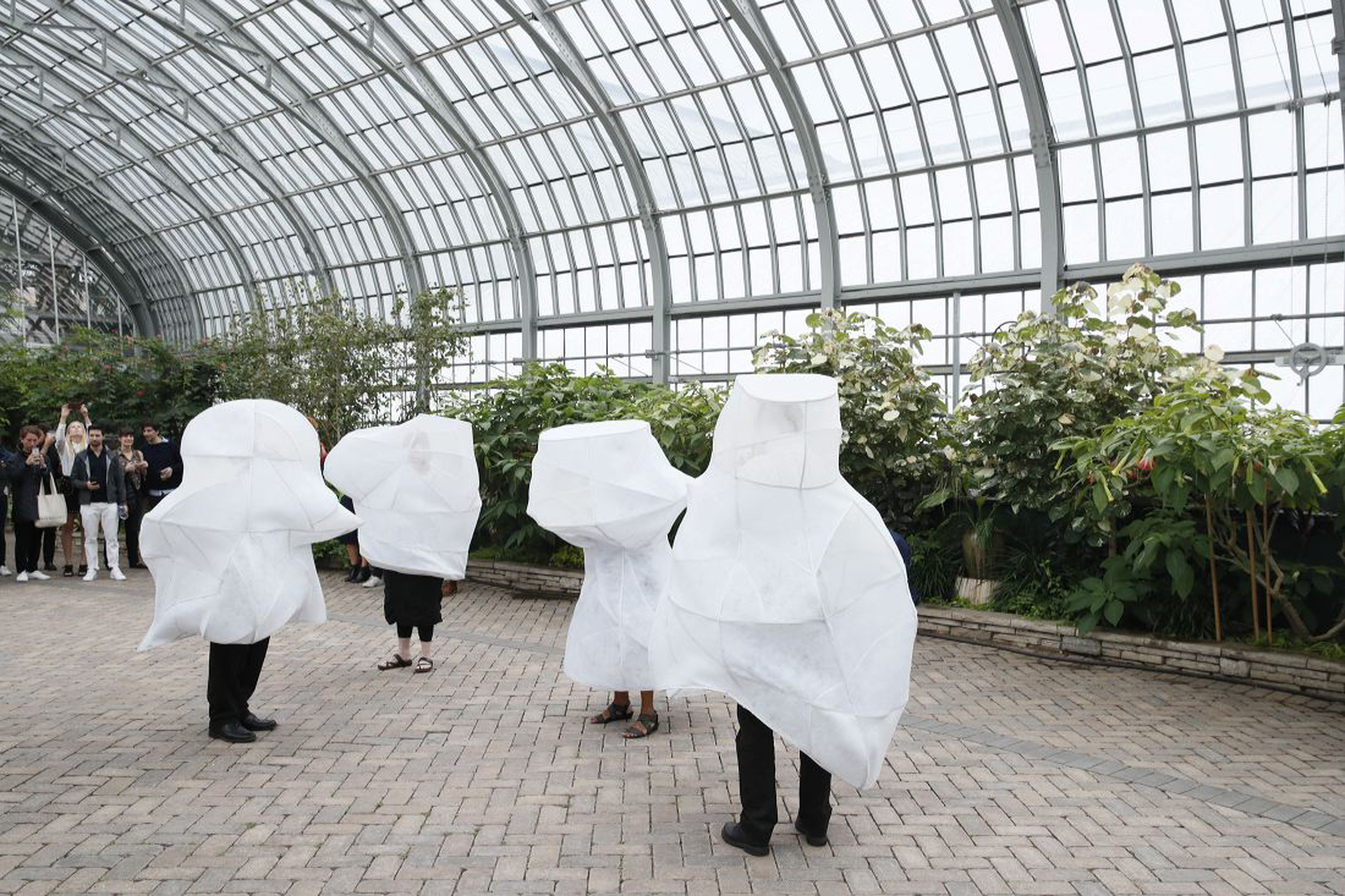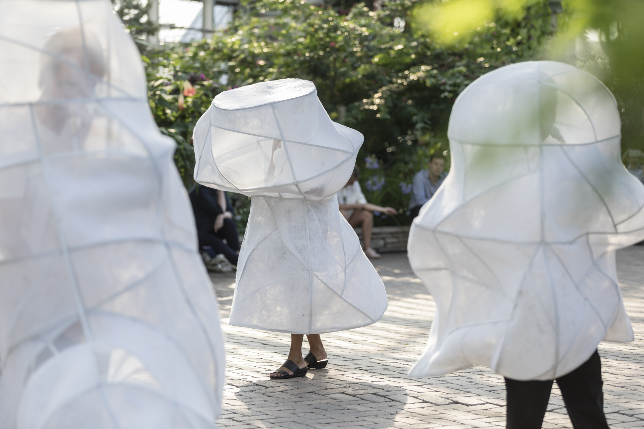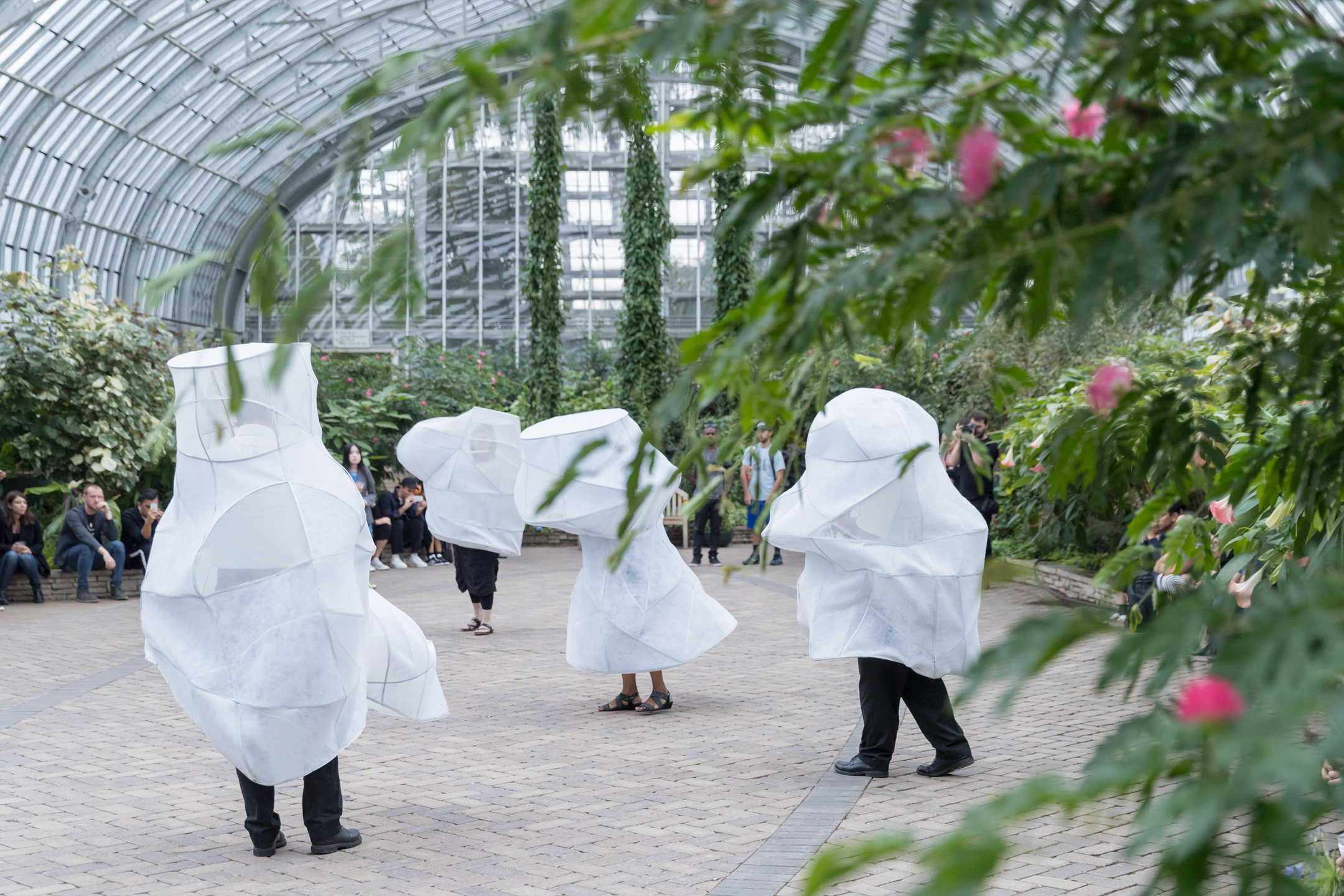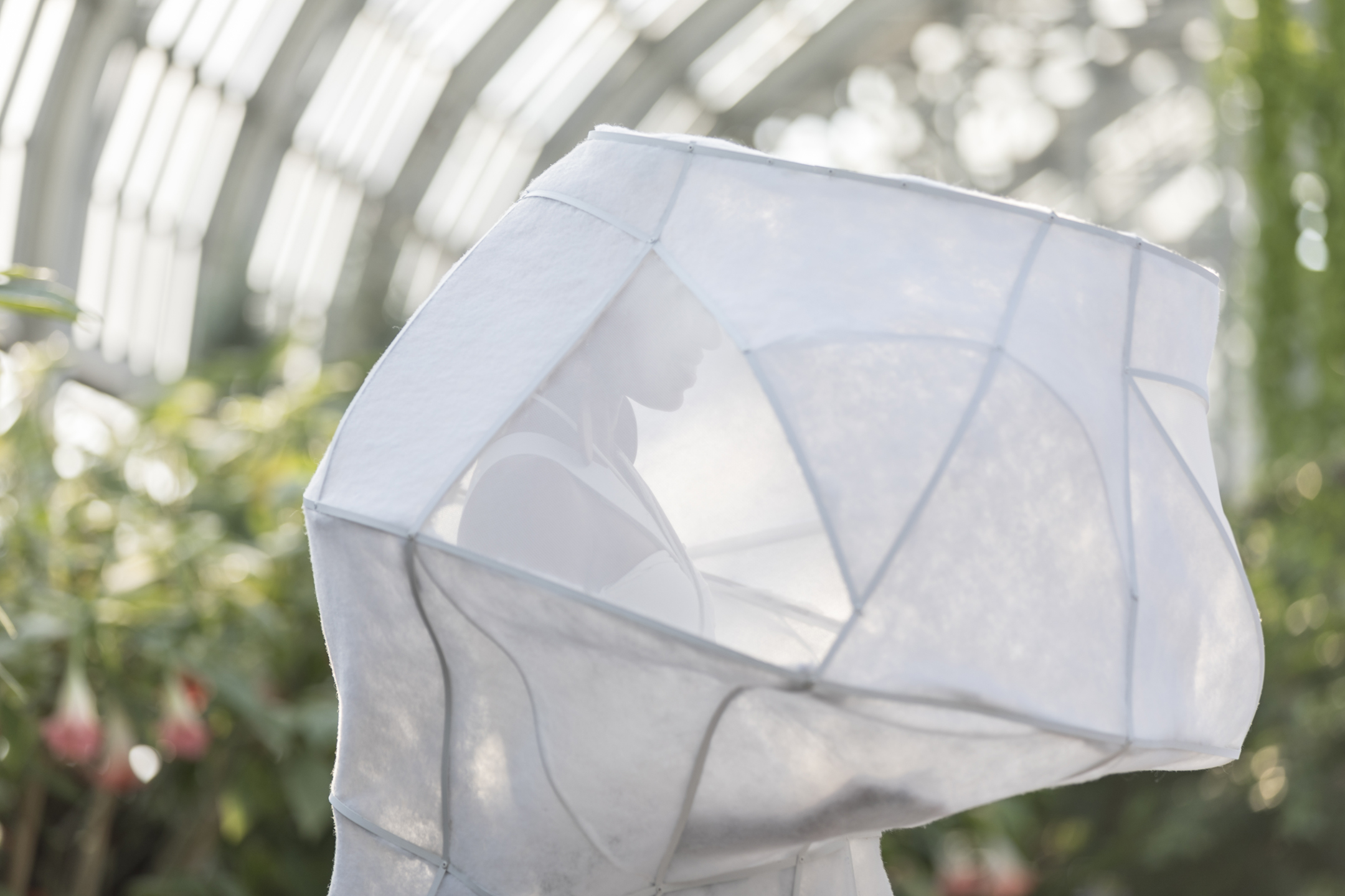 With the abundant plant life of the Garfield Park Conservatory venue as inspiration, we worked together with Prvački to create an ensemble of air-filtering mesh enclosures. Designed to clear the air through breathing, these enclosures also highlight awareness of the most familiar of spaces, personal space. An ensemble of flute, trombone, saxophone and vocals from the Chicago Sinfonietta wear the part-mask, part-shelter structures – all instruments that require air to produce music.