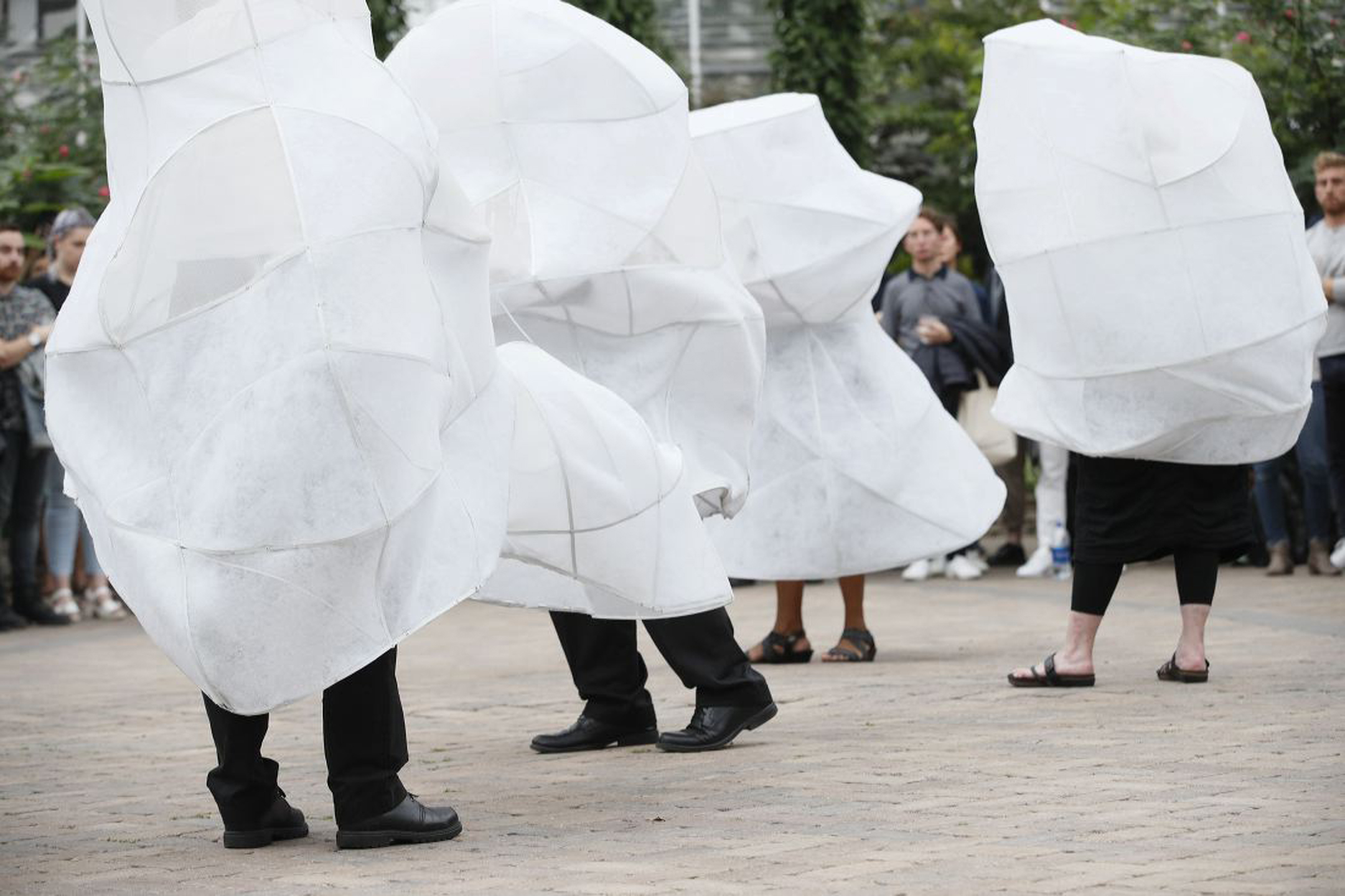 Performing an original composition by Veronika Krausas, De Aere (concerning the air), the musicians “clean the air that produces the music”, their roving forms evocative of the exchange of air between plants and human inhabitants. The installation and performance encourage its viewers to meditate upon the complex notions such as the relationship between purity and pollution, and the distinctions between self, body, objects, and nature.