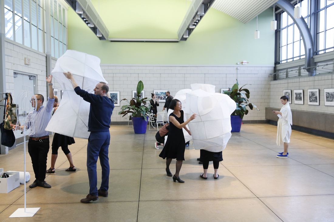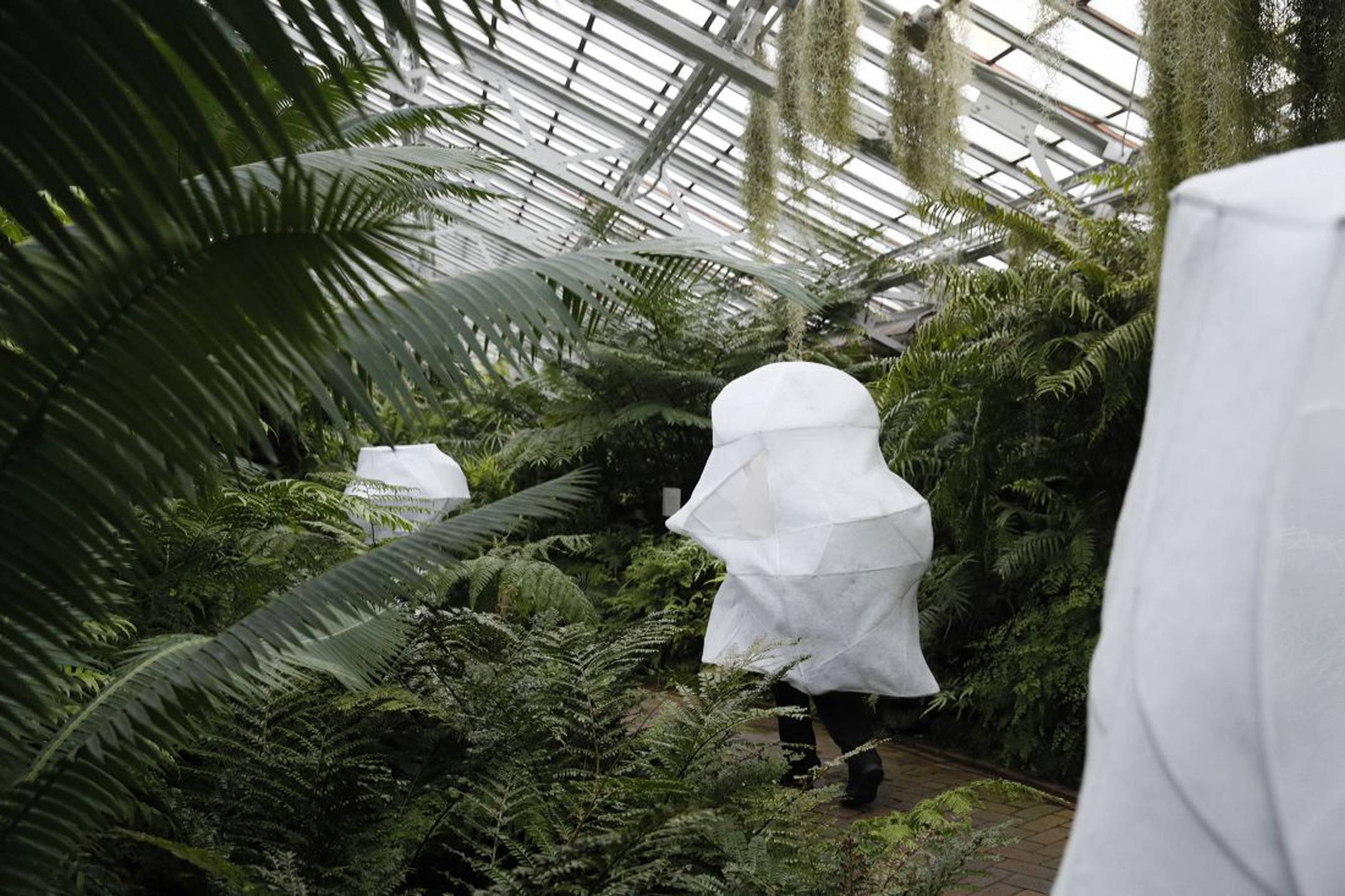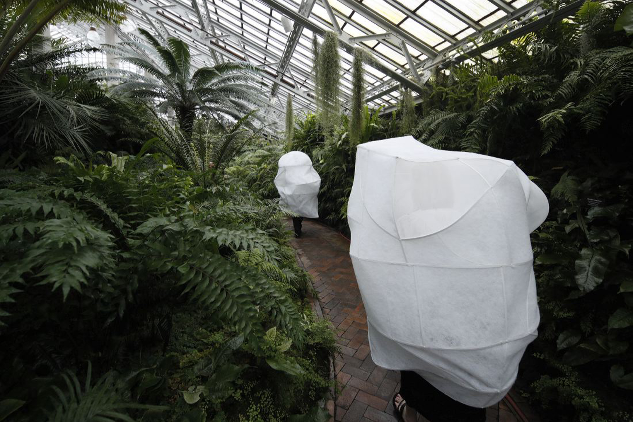 With the abundant plant life of the Garfield Park Conservatory venue as inspiration, we worked together with Prvački to create an ensemble of air-filtering mesh enclosures. Designed to clear the air through breathing, these enclosures also highlight awareness of the most familiar of spaces, personal space. An ensemble of flute, trombone, saxophone and vocals from the Chicago Sinfonietta wear the part-mask, part-shelter structures – all instruments that require air to produce music.