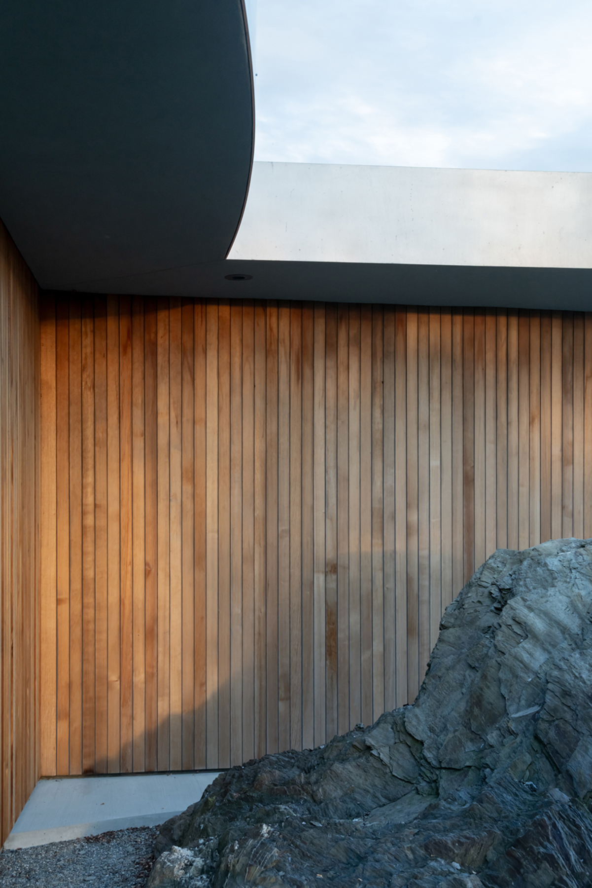 The house consists of a simple slab with angled poured-in-place concrete walls. The roof is a hybrid structure of steel and wood. Large, operable glazed panels sample the landscape and form a porous boundary between in and out, further connecting the building to its site. The slab and roof edge continue beyond the perimeter line, creating an intermediary space.