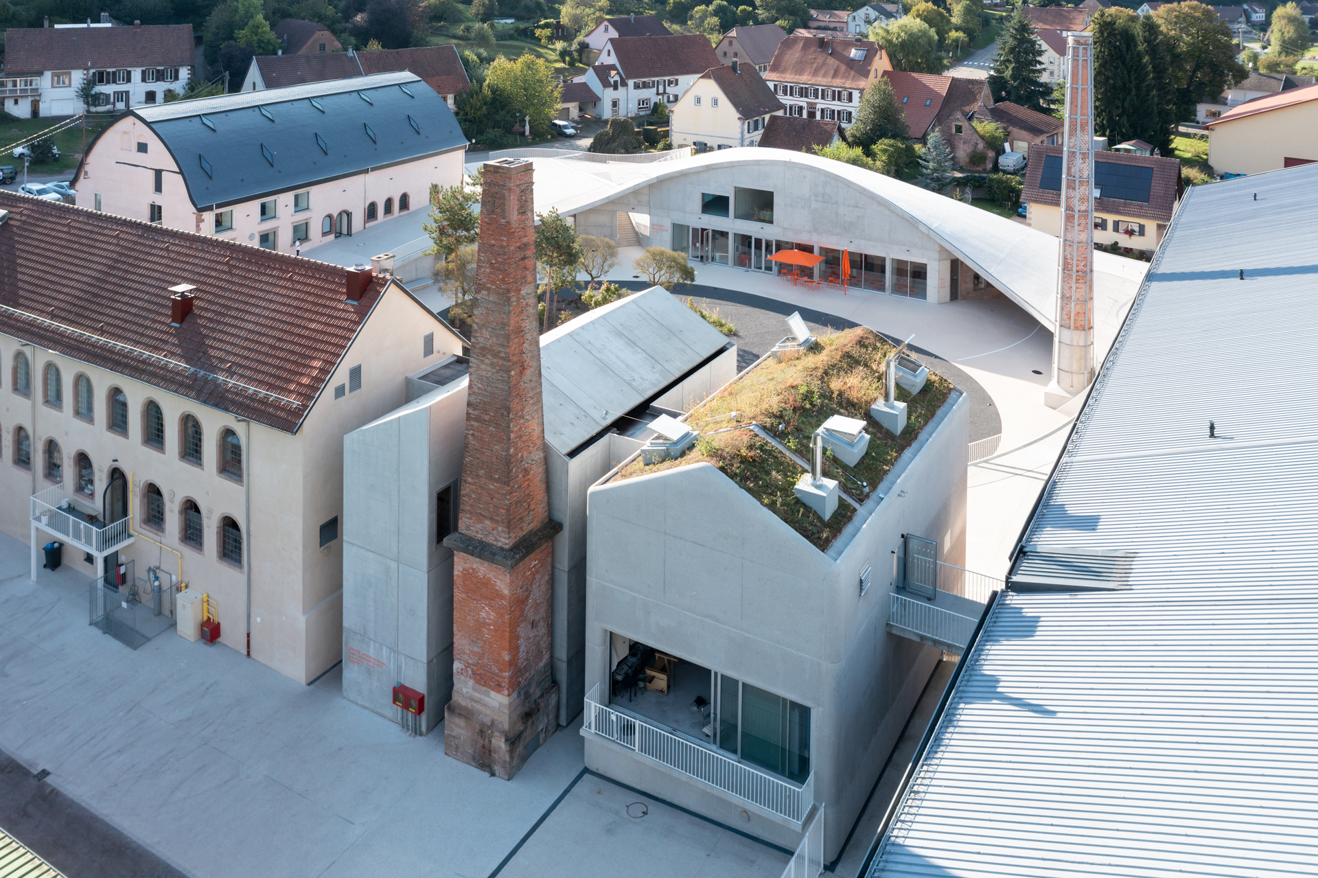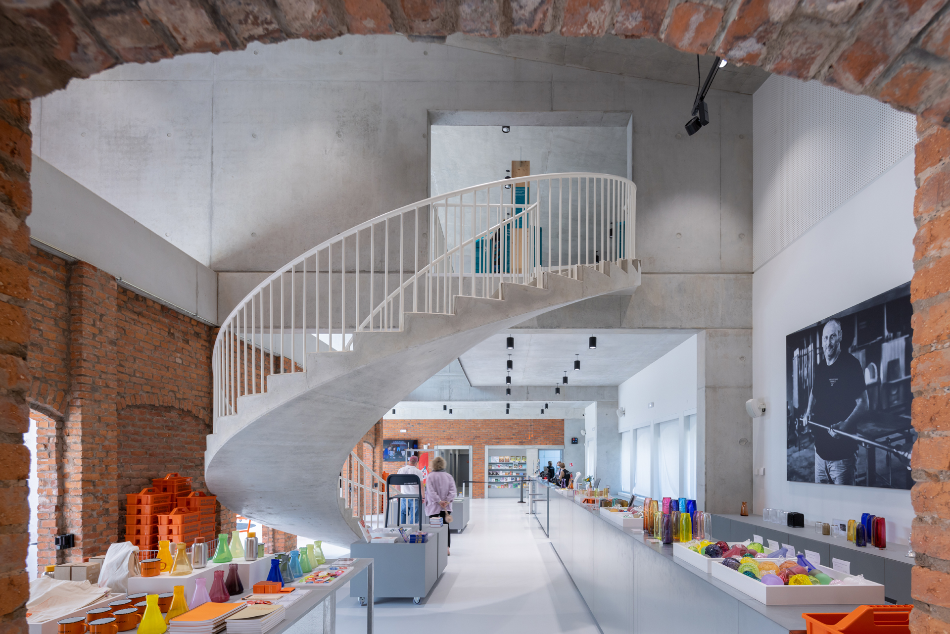 An undulating poured-in-place concrete surface alludes to glass production as it unites the buildings. The surface functions as roof, ceiling, and wall, connecting the buildings’ ground floors to frame a public plaza. New functions are sensitively introduced under and over this surface, including offices, workshop areas, a cafe and restaurant.