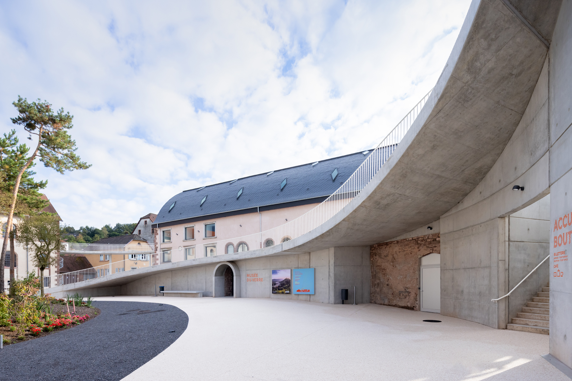 Three independent yet interrelated institutions: the glass museum (Musée du Verre et du cristal) – a living memory tracing the history of glass at the site; the CIAV (Centre International d’Art Verrier) – an international glass art center where traditional craftsmanship meets contemporary practices; and the Cadhame (Halle verrière) – a multidisciplinary cultural space hosting art installations, happenings and concerts are sited at varying floor levels. Our intervention unifies them to define a contemporary institutional identity in dialogue with an industrial heritage.