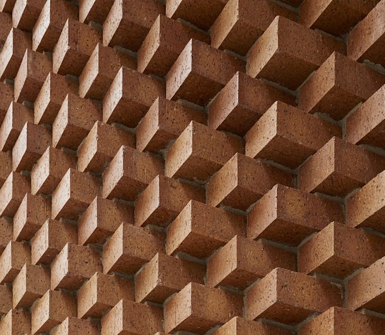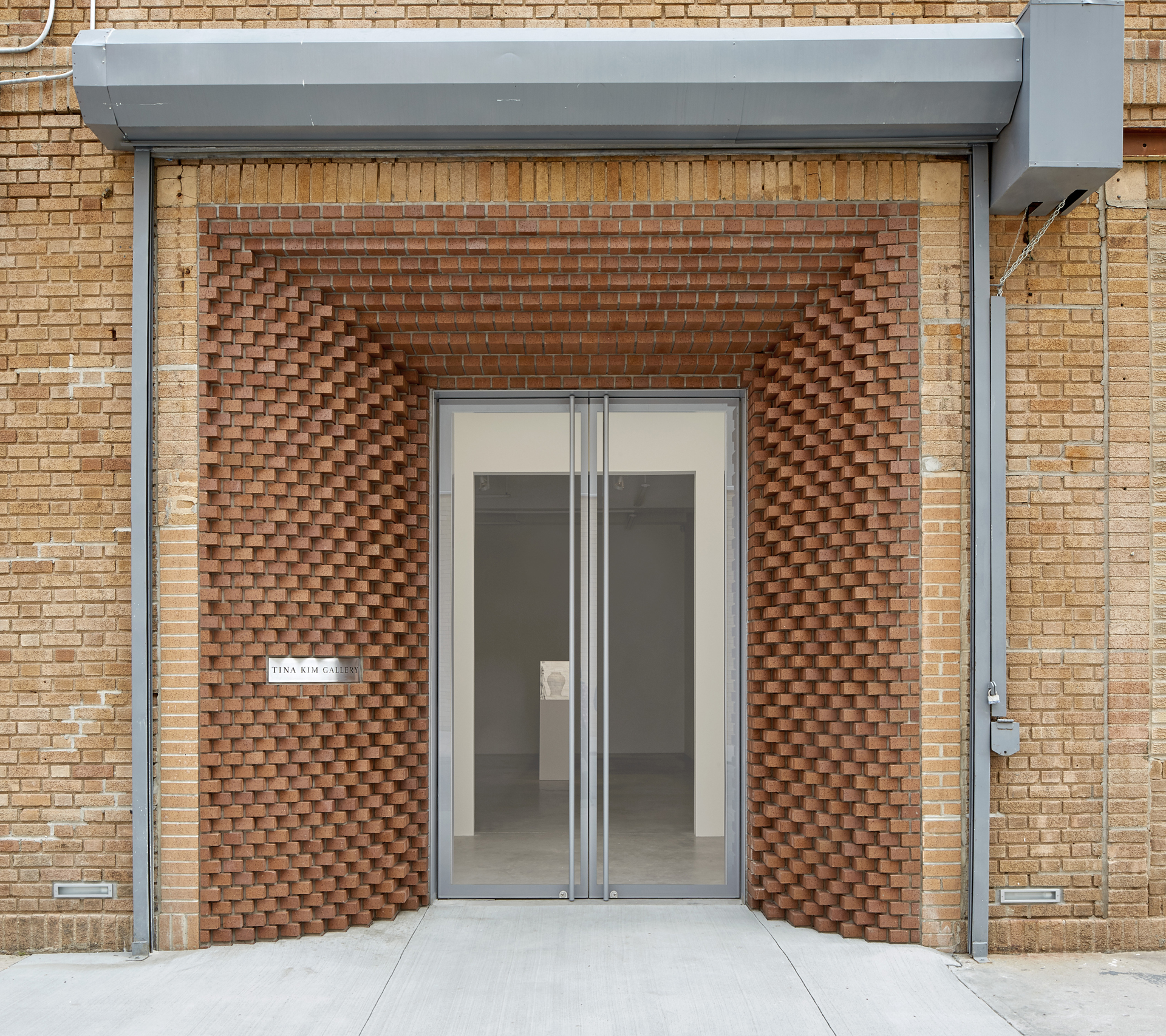 The former frosted glass door entrance aligned with the sidewalk. In a creative reinterpretation of the architectural detail known as the corbel, the new entryway gently curves inward to invite the public into the gallery. The exacting yet expressive brickwork was laid by hand following a custom computer script. This merging of a traditional technique and digital approach provides gallery visitors with an unexpected experience of the familiar.