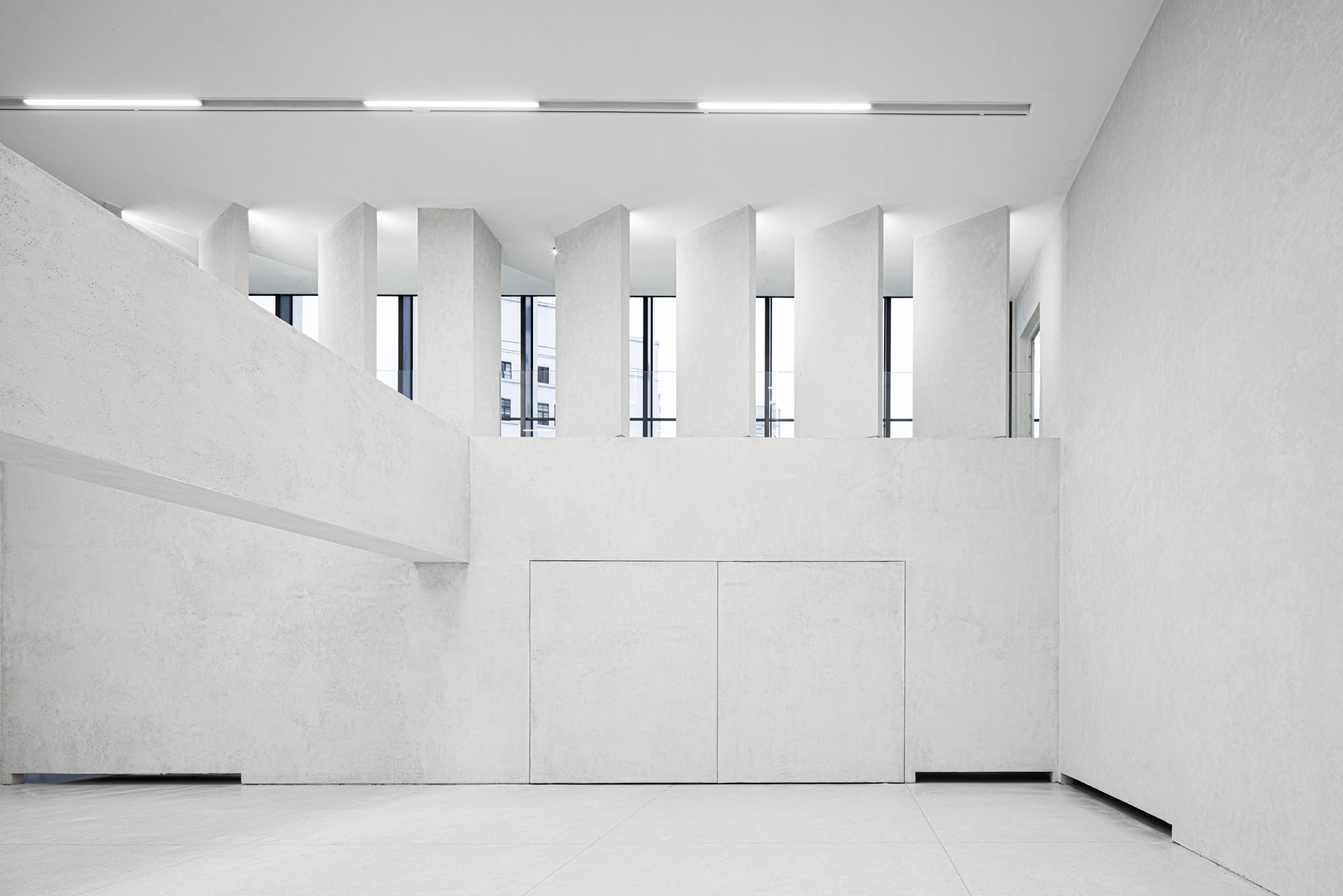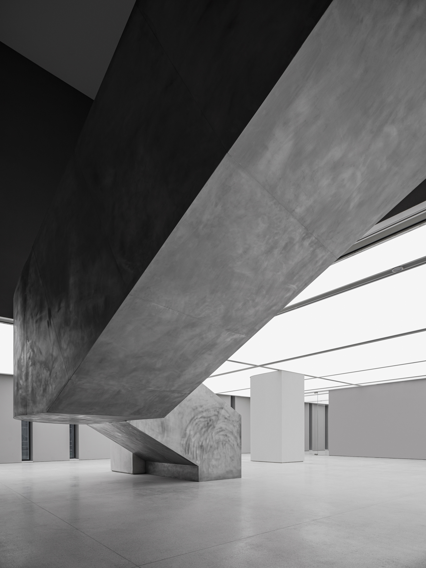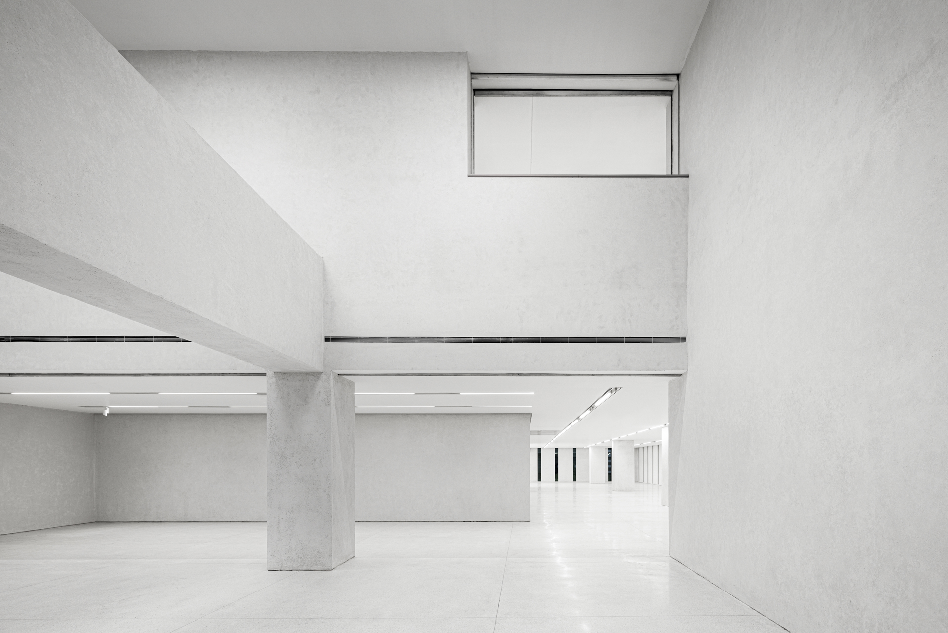 The selective puncturing of structural slabs diversify the spatial experience of its simple structural efficiency, an architectural gesture that calls attention to verticality and scale. Spaces distinguished by acoustic plaster walls finished in reflective metallic further steer the cultural institution away from a largely off-the-shelf environment context.