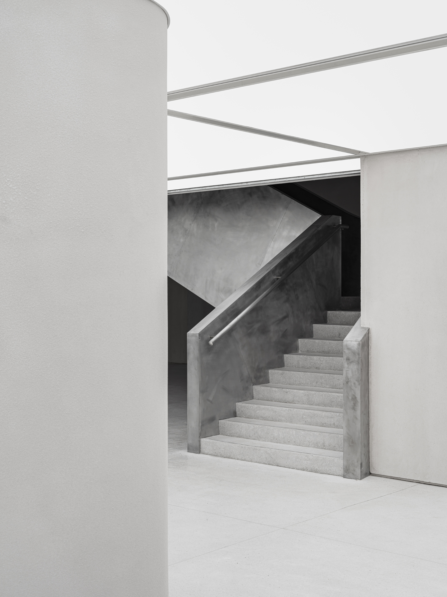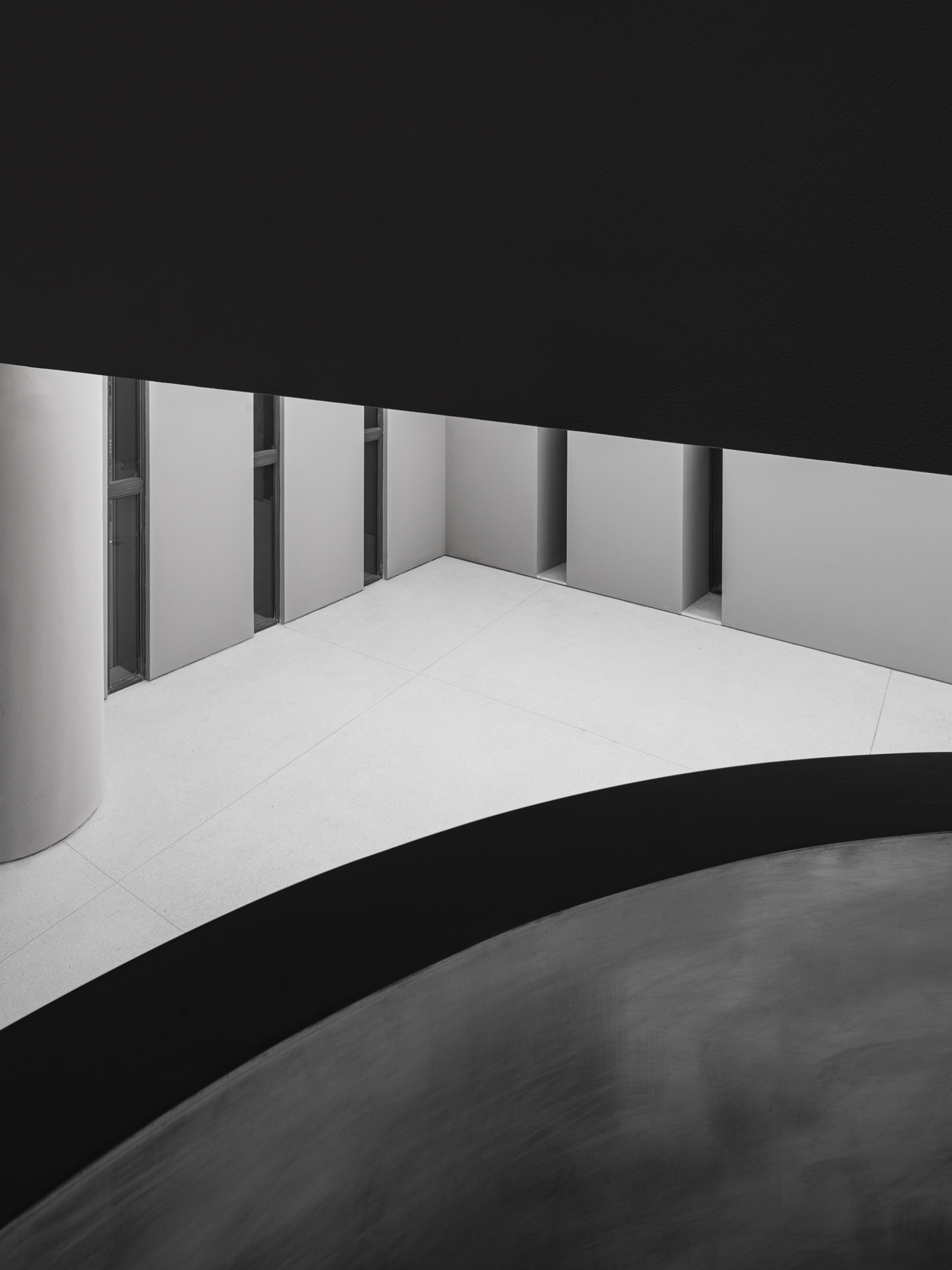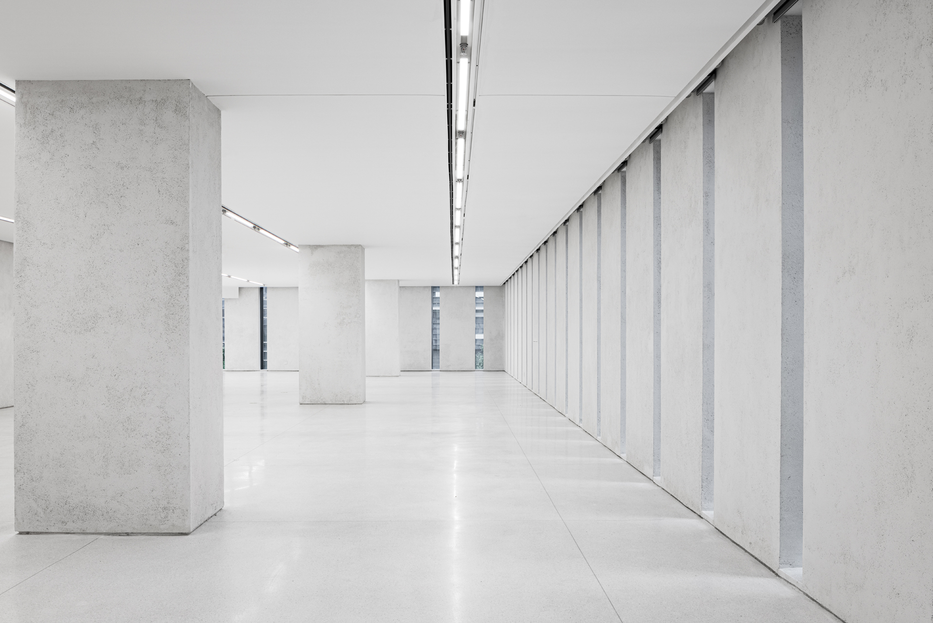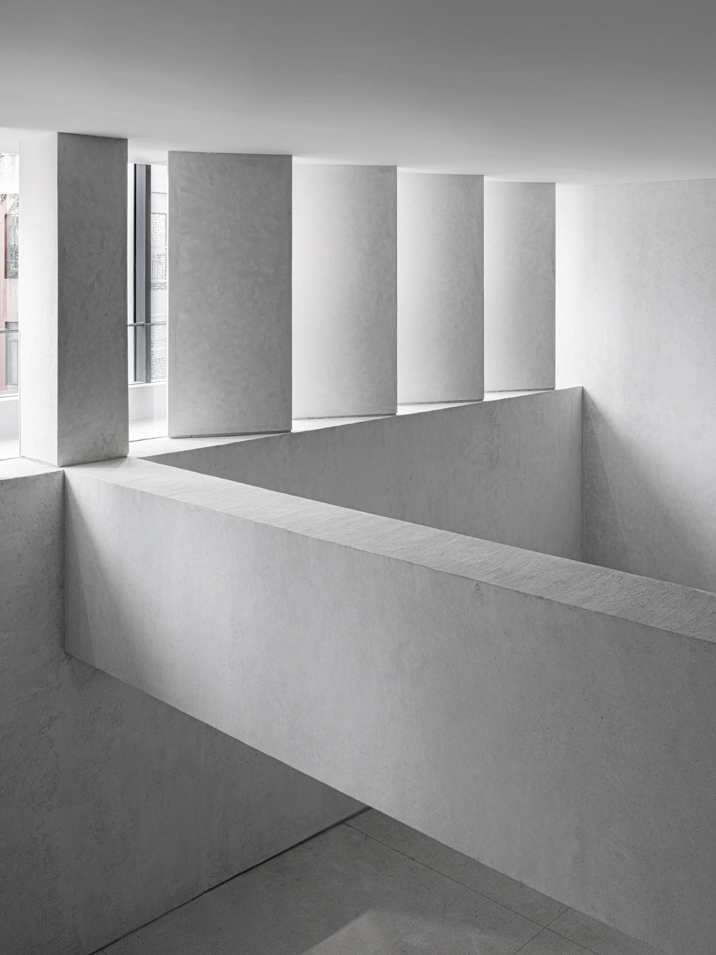 The selective puncturing of structural slabs diversify the spatial experience of its simple structural efficiency, an architectural gesture that calls attention to verticality and scale. Spaces distinguished by acoustic plaster walls finished in reflective metallic further steer the cultural institution away from a largely off-the-shelf environment context.